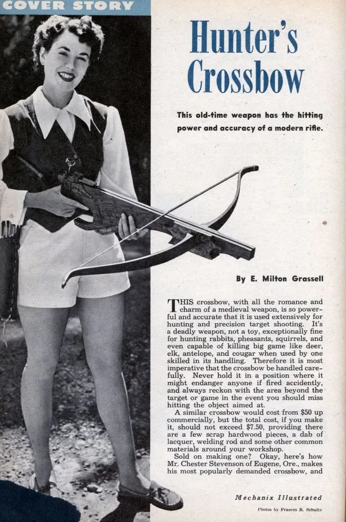 Журнал «Иллюстрированная механика». Был и такой. И… на фото девушка непременно в шортах. Классика рекламы: 20% смотрят на арбалет, 80% — на ноги…