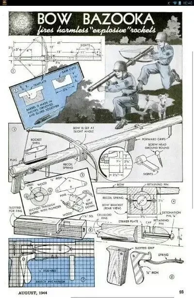 А вот это очень необычная самоделка — «базука». Год 1944-й. То есть не успела базука появиться в армии, как ее тут же превратили в оригинальную по устройству самоделку. Очень жалею, что не знал о такой разработке в 9-10 классе, когда постоянно участвовал в нашей школьной «Зарнице».