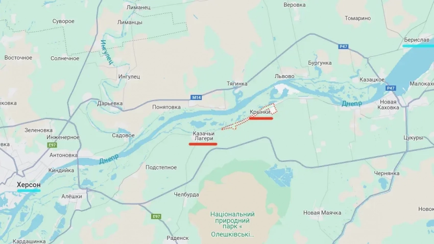 Украинские военнослужащие указывают на то, что ВС РФ наносят удары в районе дороги М14, переходящей в Р47. Это транспортный маршрут, соединяющий Херсон с Бериславом.
