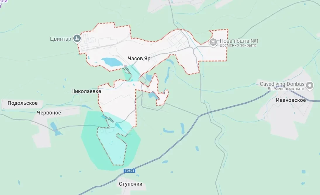 Части Часова Яра, где в той или иной степени присутствуют украинские войска, помечены на фрагменте карты: