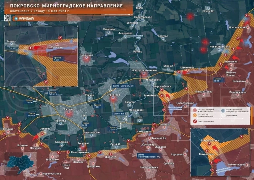 На Покровском фронте ВС РФ ведут тяжёлые бои за выход в Днепропетровскую обл. В Орехово сражение продолжается в центре села. ВС РФ зачищают посадки к югу от него, также сообщают, что почти зачищена территория между рубежами Надеждинка-Котляровка и Новоалександровка-Новониколаевка, наши выравнивают фронт. К востоку от Новоалександровки наши штурмовики продвинулись ещё примерно на 1 км. Бои идут в районе восточных окраин Новониколаевки. В Удачном и Котлино встречное сражение. На восточном фланге МО РФ сообщило об освобождении Михайловки, расположенной напротив Миролюбовки. До первых домов ключевого пригорода Мирнограда - Новоэкономического - остаётся 1,5 км. С востока к нему продвигаются наши части, которым после освобождения Малиновки осталось взять под контроль село Мирное. Его освобождение позволит начать обход Новоэкономического еще и с севера.