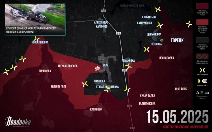 На западном фланге Торецкого фронта ВС РФ продолжают уничтожать оборону ВСУ. На гарнизон в Новой Полтавке давят с запада, востока и севера, со стороны Новоленовки продолжают двигаться вдоль русла р. Бычок к Яблоновке. Со стороны Александрополя наши штурмовики на мотоциклах совершили рывок практически до Зари, где выбили врага из ключевого опорника на холме. Со стороны Калиново наши войска вышли к западным окраинам Игнатовки. Продолжаются тяжёлые бои на восточной окраине Романовки и западной окраине Петровки. К северу от Торецка бои идут в районе п. Дылеевка и южнее села с тем же названием, сообщает Олег Царёв в своём Telegram-канале.
