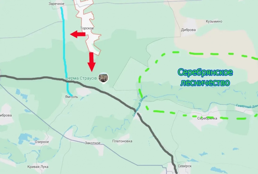 Сейчас под огневой контроль ВС РФ перешла автодорога Заречная – Ямполь, а также участок железной дороги, идущей в направлении Северска (голубым обозначена указанная автодорога, серым - железная).