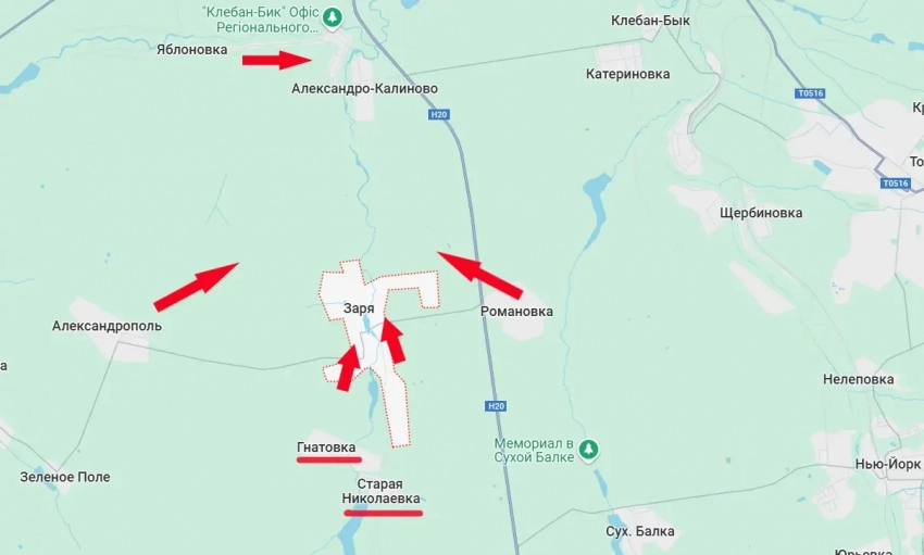 Наши войска сходящимися ударами проводят ликвидацию остатков подразделений противника, бегущего из села Заря в направлении Александро-Калиновки. Одновременно с этим идёт преследование отступающих подразделений ВСУ. С учётом того, что ВС РФ ведут бои и в Романовке, над гарнизоном противника в районе Александрово-Калиновки, нависает та же угроза, что и в Заре - попадание сначала в «карман», а затем и формирующееся кольцо окружения.