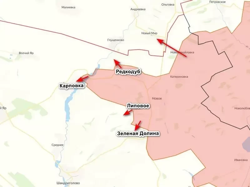 Наступление российских войск на Красно-Лиманском направлении продолжается, несмотря на попытки противника его остановить. После взятия Редкодуба и входа в Карповку, наши начали продвижение и в сторону Зеленой Долины, причем весьма успешно. Как отметил военный эксперт, подполковник НМ ЛНР в отставке Андрей Марочко, наиболее активные бои идут в районе Липового и Зеленой Долины.