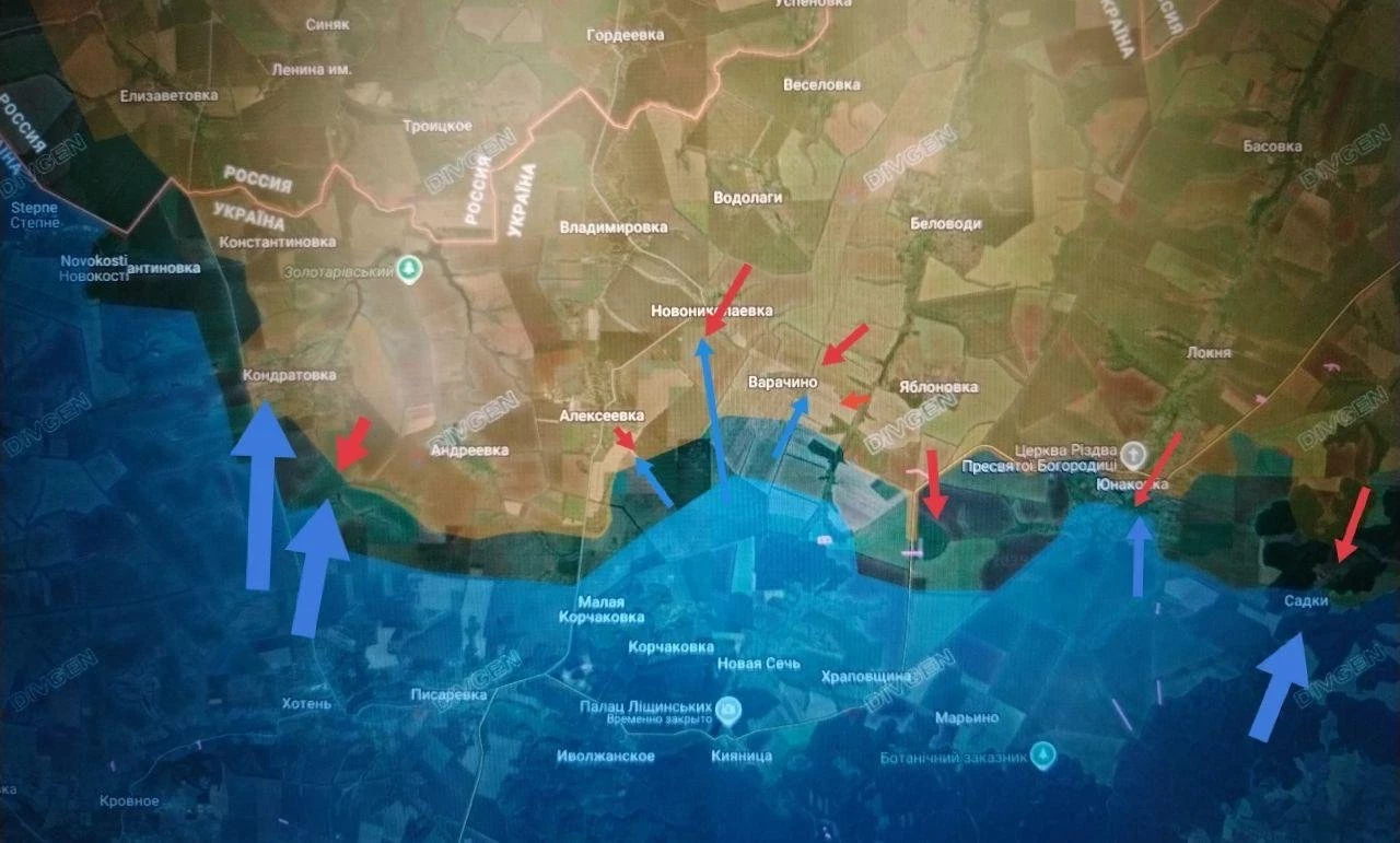 На Сумском направлении после того как наши войска выбили ВСУ из Гуево, враг оттянул остатки сил в Александрию, село находится в низине. Западнее идут бои в районе Садков, наши морпехи зачищают от вражеских сил лесные участки.