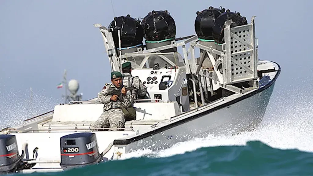 Патрульная лодка КСИР проплывает рядом с грузовым судном в Персидском заливе. 2024 год.