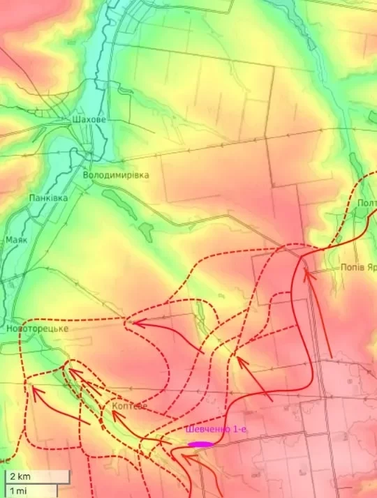 Наступление идет от н.п. Шевченко (южнее от этой карты) западнее Фёдоровки (по полям и лесополкам) и далее от Комара на запад, где сегодня полностью взят под контроль н.п. Перестройка.