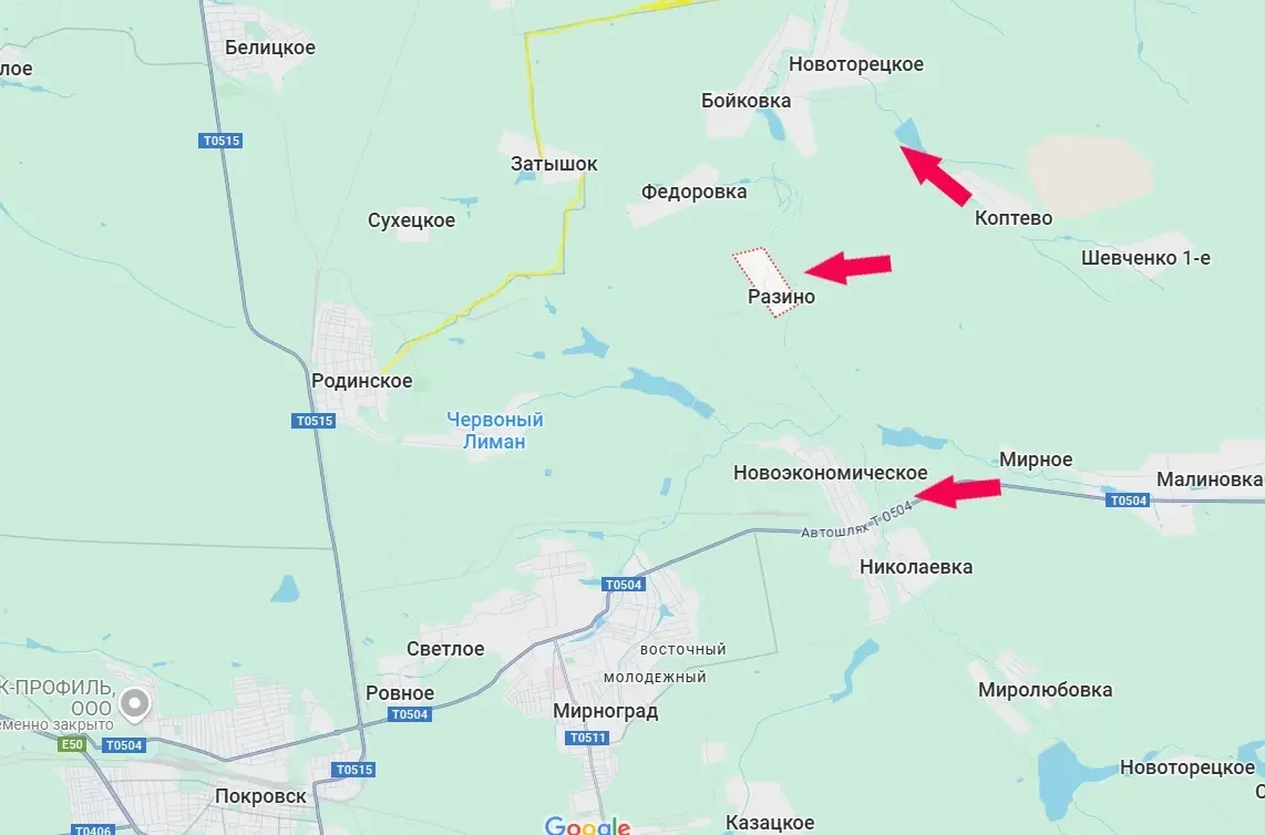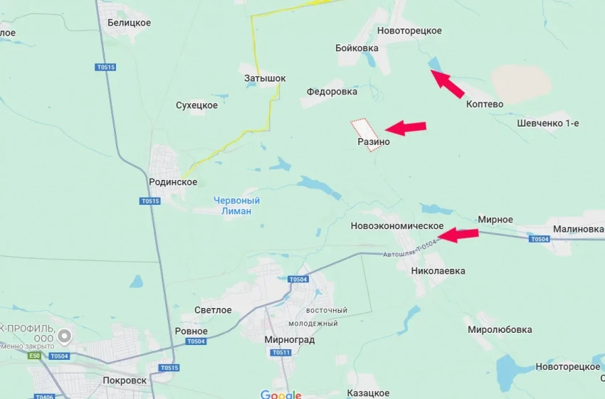 Двигаясь от упомянутого Коптево, ВС РФ подошли к восточной окраине села Разино, что у берега реки Казённый Торец. Также фиксируется продвижение северо-западнее Коптево – к Новоторецкому.