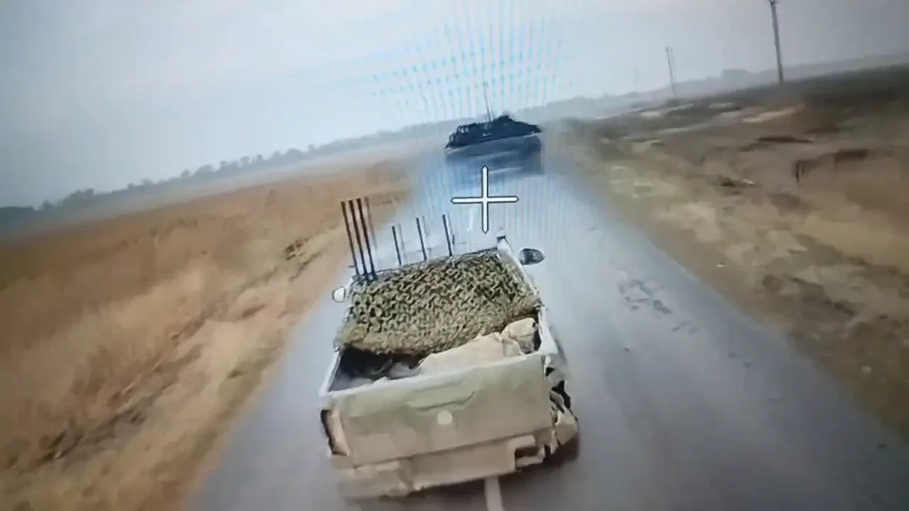 Боевое применение БПЛА «КВН». На переднем плане — машина противника с комплексом РЭБ. Беспилотник игнорирует её и движется к цели. Фото Telegram / «Хроника оператора БПЛА»