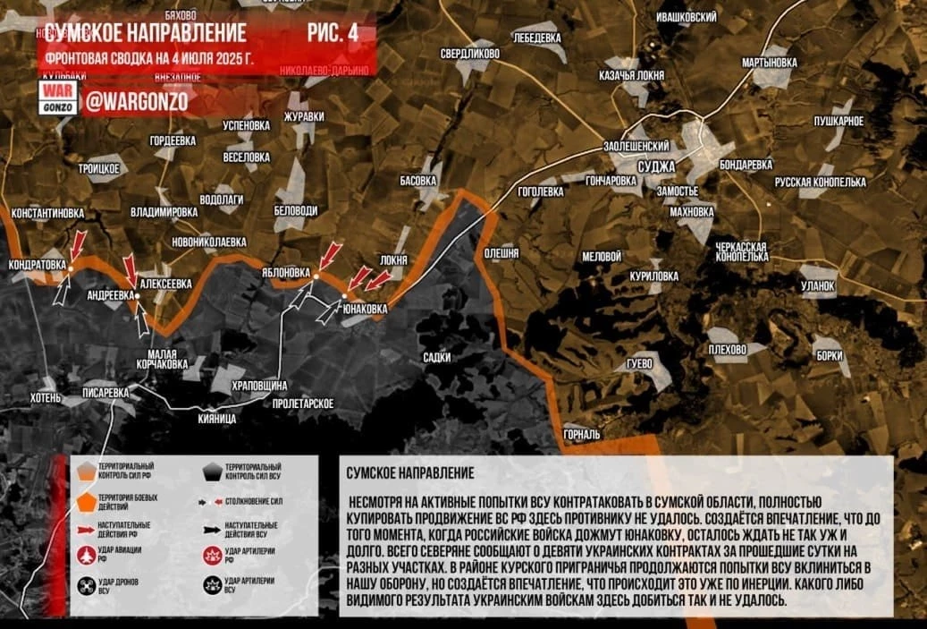 На Сумском направлении несмотря на активные попытки ВСУ контратаковать в Сумской области, полностью купировать продвижение ВС РФ здесь противнику не удалось. Создаётся впечатление, что до того момента, когда российские войска дожмут Юнаковку, осталось ждать не так уж и долго. Всего северяне сообщают о девяти украинских контрактах за прошедшие сутки на разных участках. В районе Курского приграничья продолжаются попытки ВСУ вклиниться в нашу оборону, но создаётся впечатление, что происходит это уже по инерции. Какого-либо видимого результата украинским войскам здесь добиться так и не удалось.