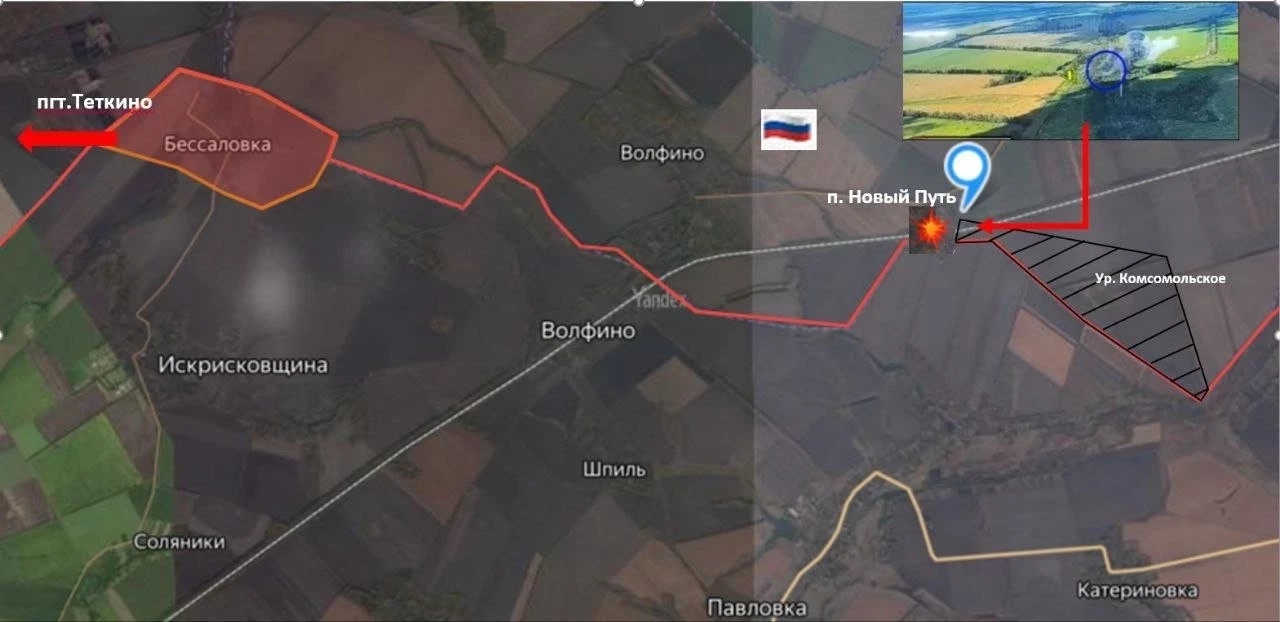 На участке около п.Новый Путь (центральная часть) зафиксировали присутствие штурмовой группы ВСУ. ВС РФ нанесли авиабомбовый удар по этой точке. На данный момент от урочища Комсомольское до места поражения добавляется серая зона. Ведём работу по обнаружению и выбиванию оттуда противника.