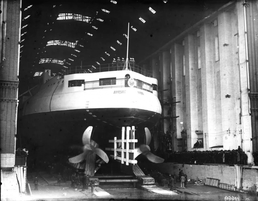 Эскадренный броненосец «Бородино» был спущен на воду в августе 1901 г. и вскоре был переведен к стенке Общества Франко-русских заводов. Там корабль простоял весьма долго и, после установки котлов и машин, возобновил достройку на Галерном островке в июле 1902 г. В Кронштадт же «Бородино» ушел, как я понимаю, в апреле 1904 г. Таким образом, достройка корабля после его спуска на воду силами Санкт-Петербургского порта за минусом времени на установку машин составила 1 год и 10 месяцев.
