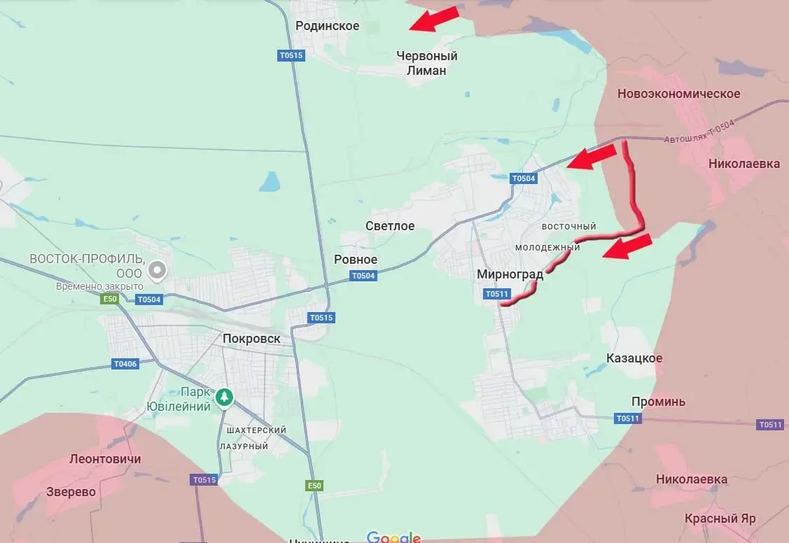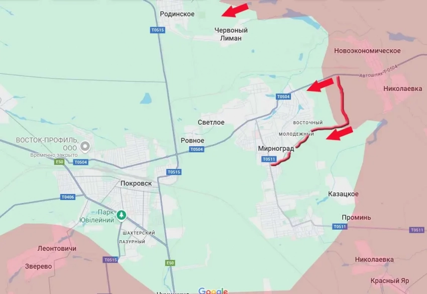 По состоянию на текущий момент боевые действия идут уже на северо-восточной окраине города. Под контроль армии России перешёл перекрёсток дорог южного обхода Мирнограда. Южнее это ответвление переходит в улицу Пугачёва (или как там теперь её после всех серий переименований…). Большая часть южного обхода города тоже под контролем ВС РФ, остальное - в так называемой серой зоне.