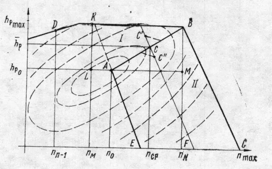 1. Положение рейки топливного насоса hp соответствует максимальной подаче топлива, Lт соответствует режиму в точке В, частота вращения коленвала n ниже точки максимального крутящего момента nmax (1700 оборотов в минуту).