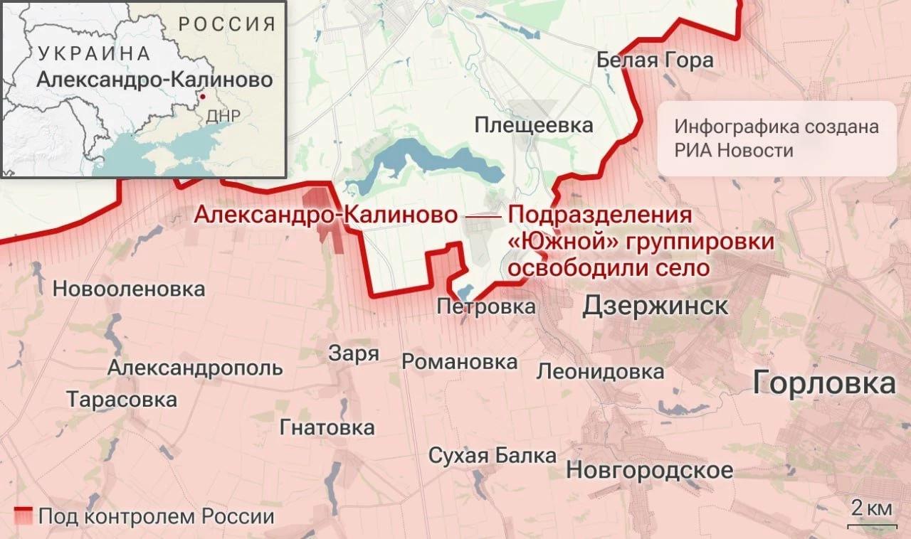 Бойцы российской армии осуществили неожиданный удар по силам ВСУ в ходе возвращения контроля над населенным пунктом Александро-Калиново в ДНР, и установили контроль над нам, войдя в село с северного направления, сообщает РИА Новости.