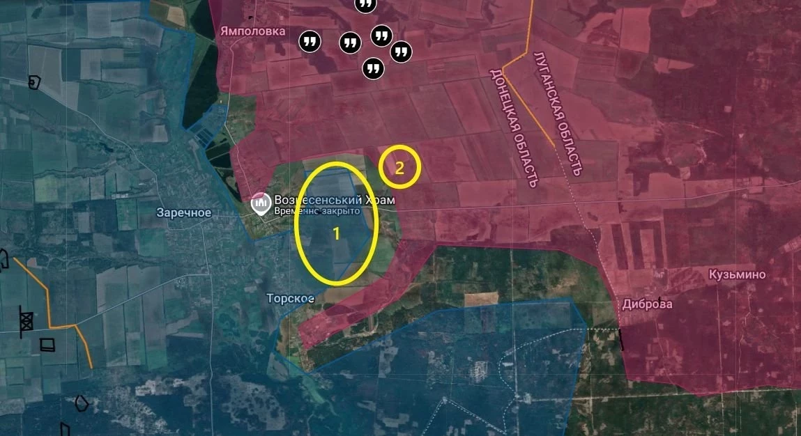 В Торском наши войска продолжают выбивать противника из района Рыбхоза. Центр Торского ещё за ВСУ, но численность наших войск в населенным пункте уже превысила вражескую группировку. По участку 1, возможно ВСУ оттуда ушли. Основной укреп с пулемётом у них был в точке 2, после потери которого они вполне могли оставить и остальные окопы. Южнее села с боями продвигается вперёд 164-я бригада, отрезая оставшиеся позиции хохлов западнее Диброва.