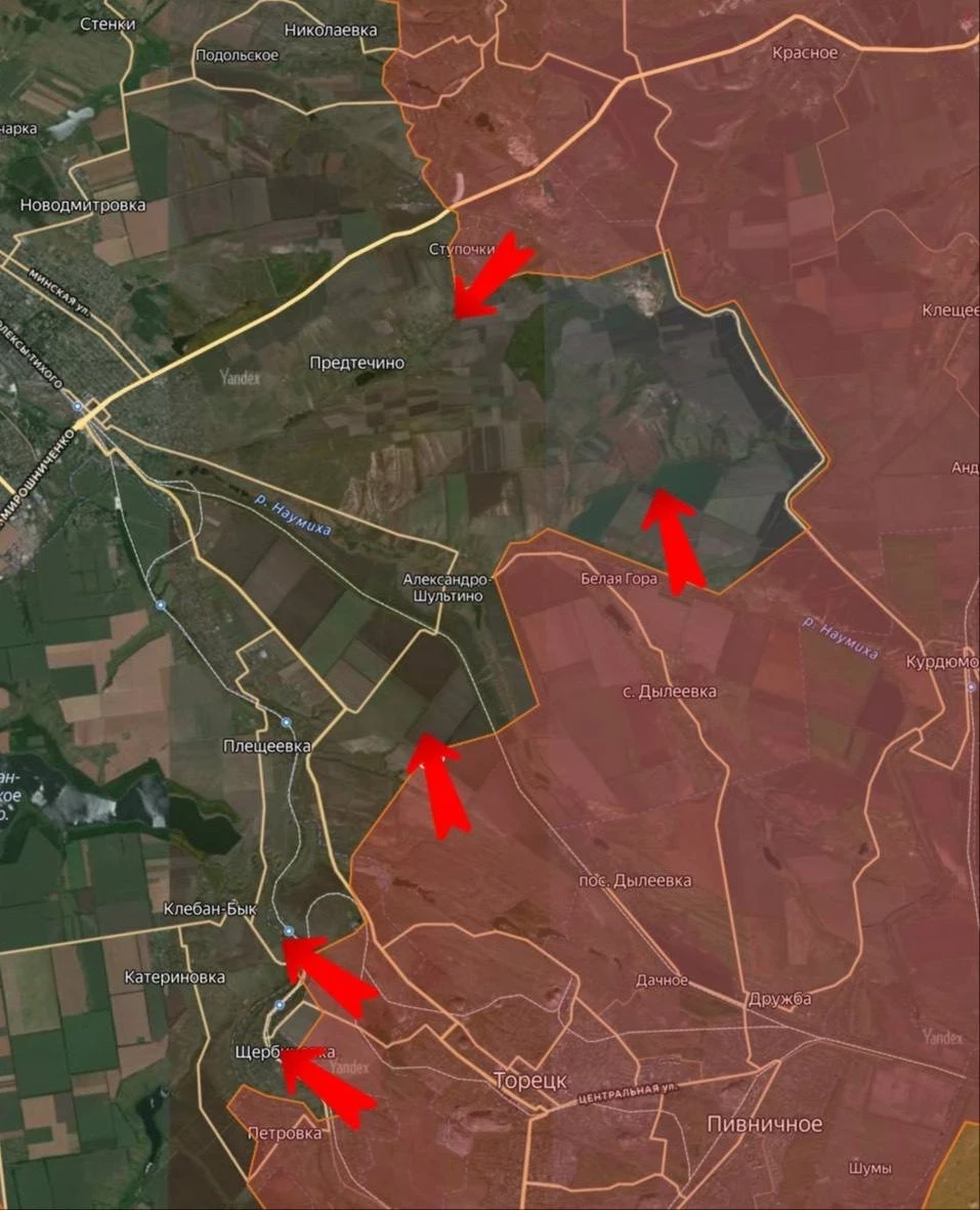 Северо-восточнее Белой Горы наши бойцы продвинулись на 2,5 км, взяв под контроль часть балки. На подступах к Клебан-Быку и Катериновке ВС РФ уничтожают логистику противника, осложняя снабжение гарнизонов. У Щербиновки продолжается наступление - населённый пункт расположен у водоёма, что ограничивает манёвры ВСУ.