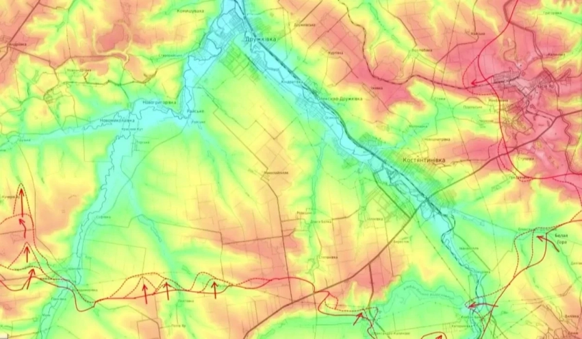 Идут бои по уничтожению окруженной группировки южнее Клебан-Быкского водохранилища - в Клебан-Быке и Екатериновке. Кроме того, ВС РФ пытаются продавить оборону западнее Часова Яра. Таким образом, наступление на Константиновку ведется комплексно с нескольких направлений.