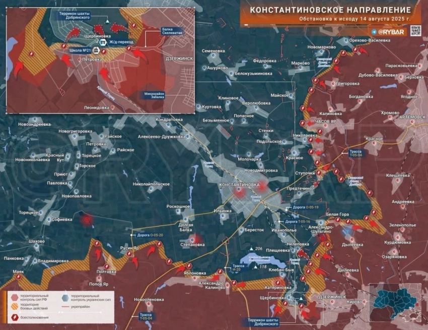 На Константиновском направлении со стороны Полтавки и Русин Яра ВС РФ продвинулись в сторону Софиевки. МО РФ сообщило об освобождении Щербиновки. Севернее идут бои в районе Плещеевки и Нелеповки, а также Александро-Шультино. Со стороны Часов Яра развивается наступление в районе Предтечино. Выше по карте ВС РФ продвинулись южнее Майского в сторону Веролюбовки.