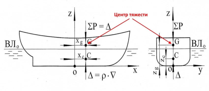 Как вообще возникает крен и дифферент? У любого корабля есть точка, именуемая центром тяжести. Обычно центр тяжести расположен в диаметральной плоскости, чуть вперед от мидель-шпангоута.