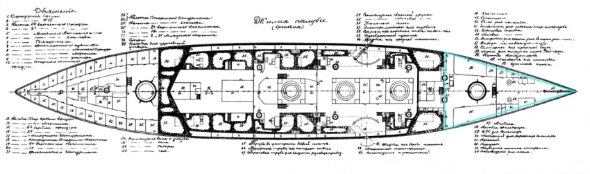 Как видно из схемы выше, данный объем затоплен не полностью – практически на всем протяжении отсека вода до «потолка», то есть батарейной палубы, не доходит. В то же время точное количество воды, которое мог принять броненосец, будет зависеть не только от его дифферента, но и от осадки, а она, в свою очередь, – от массы воды, принятой на жилую палубу, ниже ее и в районы угольных ям левого борта.