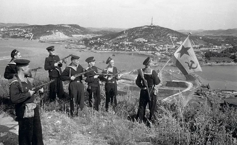 Моряки десантной команды Тихоокеанского флота водружают Военно-морской флаг СССР над бухтой Порт-Артура