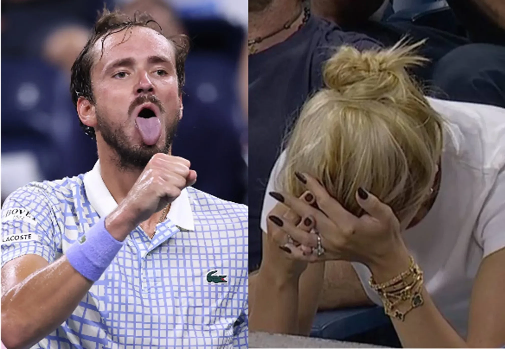 Кроме того, на протяжении игры Медведев демонстрировал неприличные жесты — облизывал и целовал сжатый кулак, а когда матч в итоге завершился его проигрышем, то сломал ракетку прямо перед зрителями. При этом камера засняла реакцию жены теннисиста, которая присутствовала на матче. Дарья закрывала лицо руками, а в конце поспешно покинула трибуны.