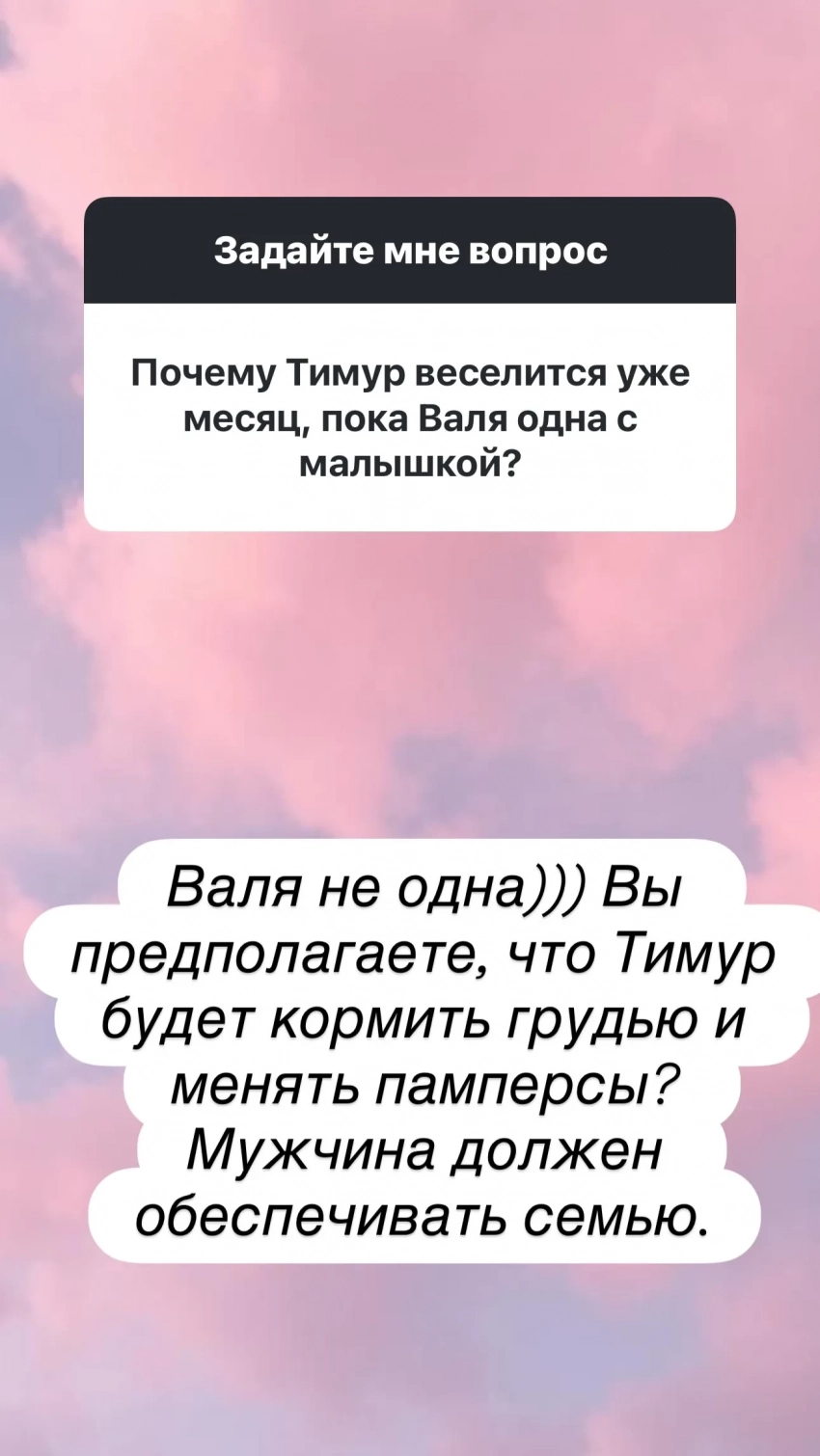 "Это его работа и заработок. Валя не одна. Вы предполагаете, что Тимур будет кормить грудью и менять памперсы? Мужчина должен обеспечивать семью", — написала Юнусова.