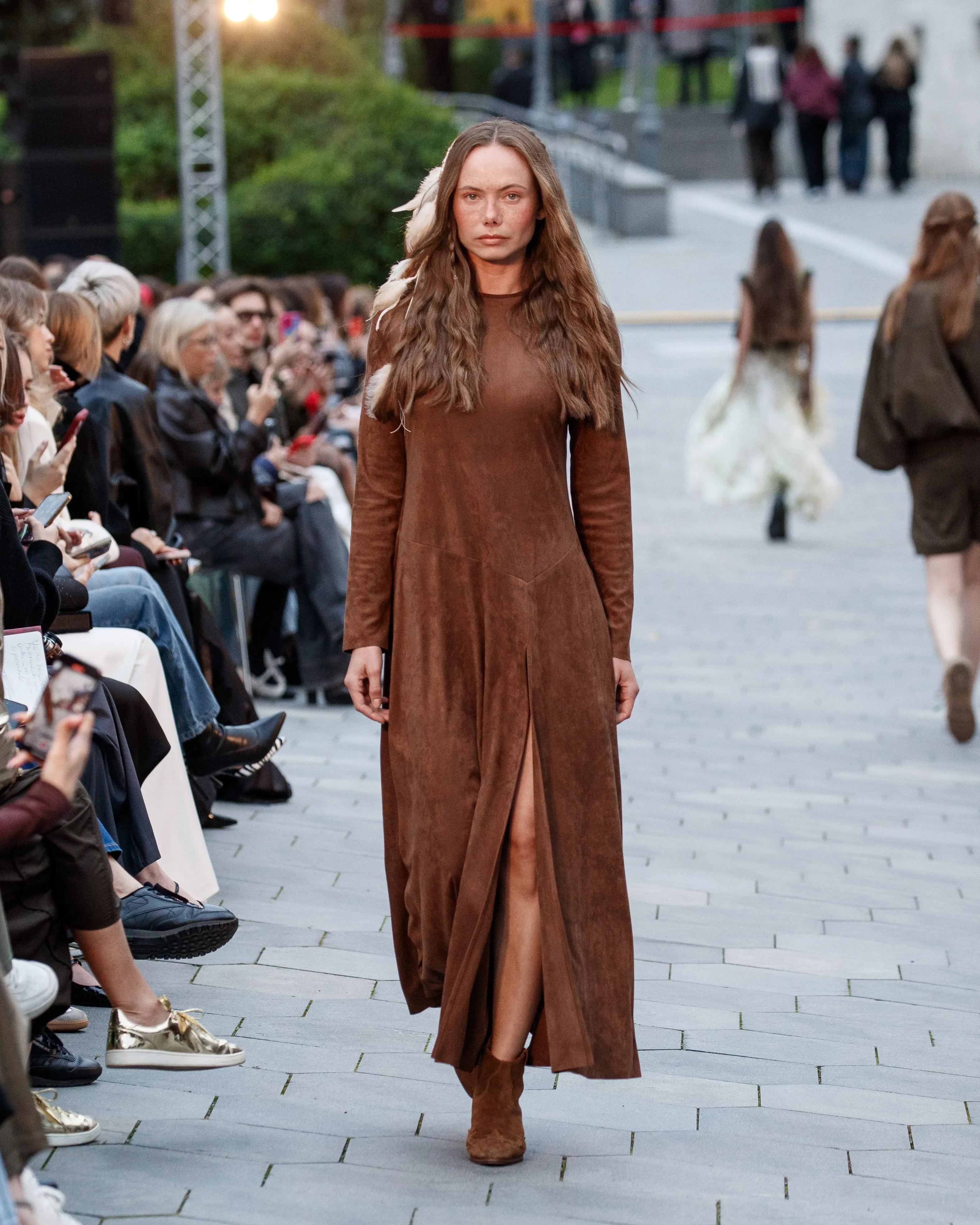 https://t.me/spletnik2006/39403Светлана БондарчукСветлана БондарчукВиктория ШеляговаЕлена ЛетучаяЕлена Летучая и Виктория ШеляговаТакже выделился показ бренда Masterpeace, который прошёл прямо на улице Варварке. Перед самим мероприятием выступили девушки в русских народных кокошниках. Московский бренд представил коллекцию в стиле богемного шика под названием "Сказка в стиле бохо", переплетённую с фольклорными мотивами. В неё вошли кожаные жакеты, блузы с летящими юбками и платья с воланами.