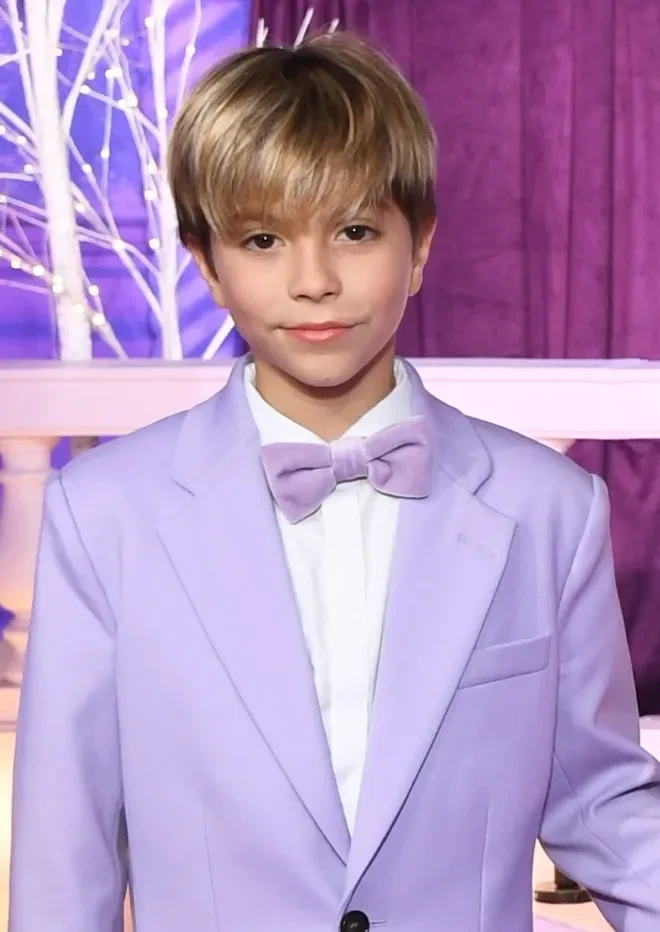 Певица вышла на красную дорожку в фиолетовом платье с разрезом и позировала вместе с детьми: 12-летним Миланом и 10-летним Сашей, которые были одеты в смокинги такого же цвета.