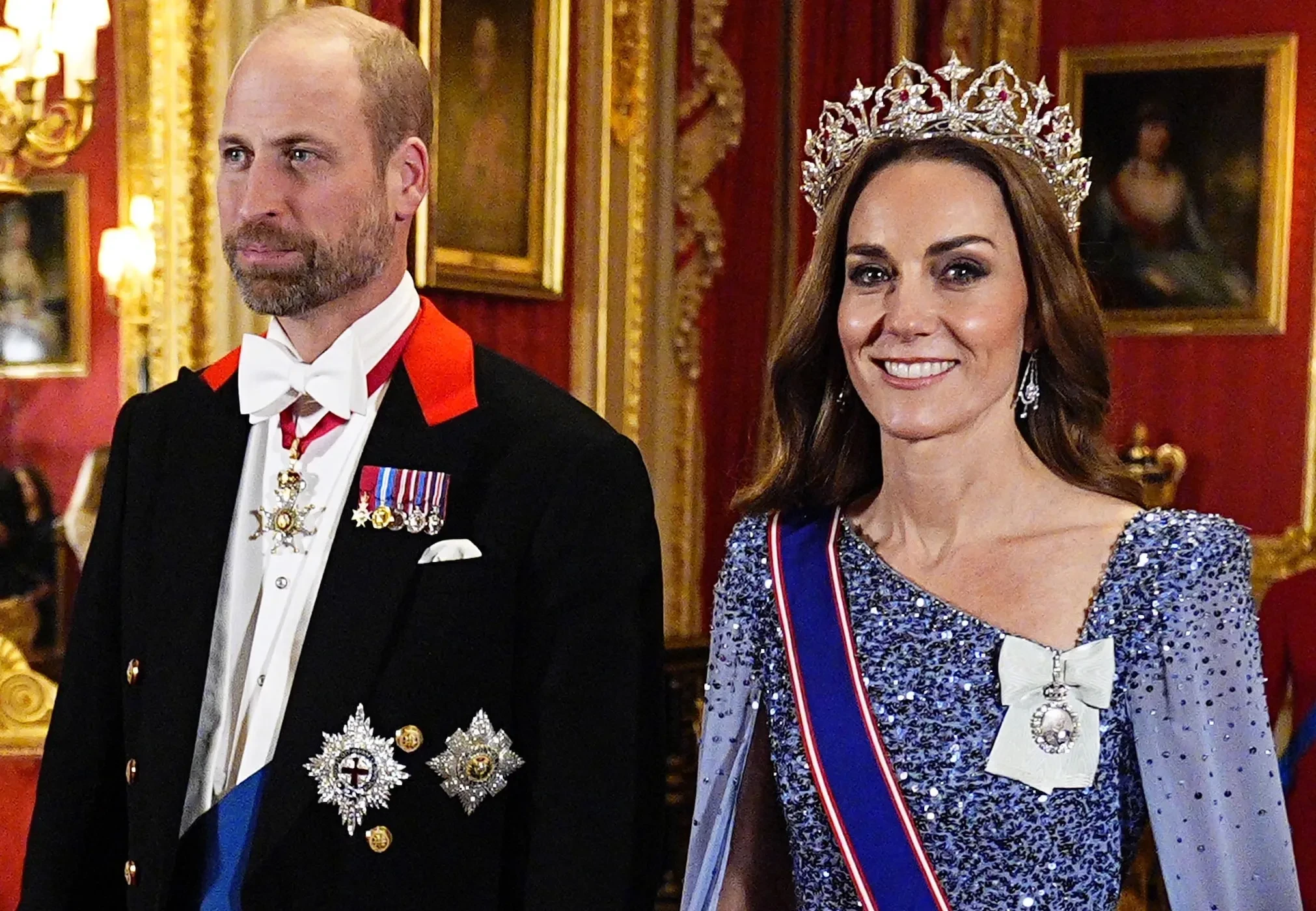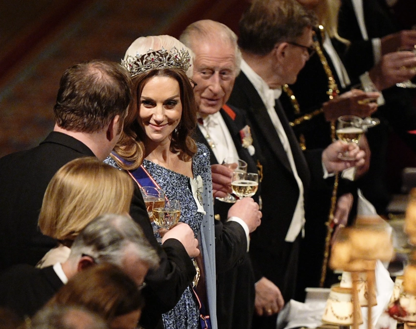 Кейт Миддлтон в редкой тиаре, принц Уильям, Клаудия Шиффер, король Карл III и королева Камилла на банкете в Виндзоре