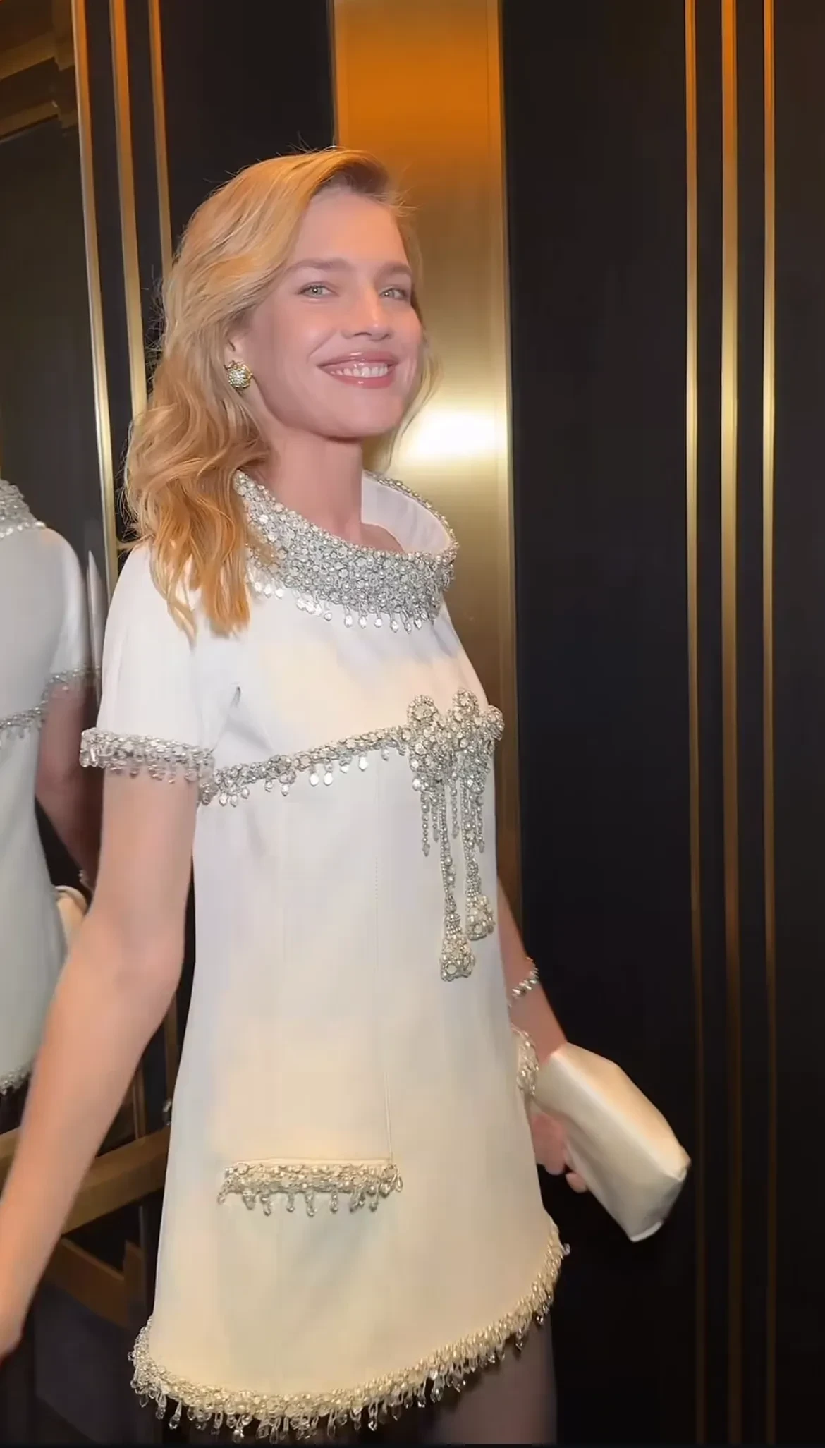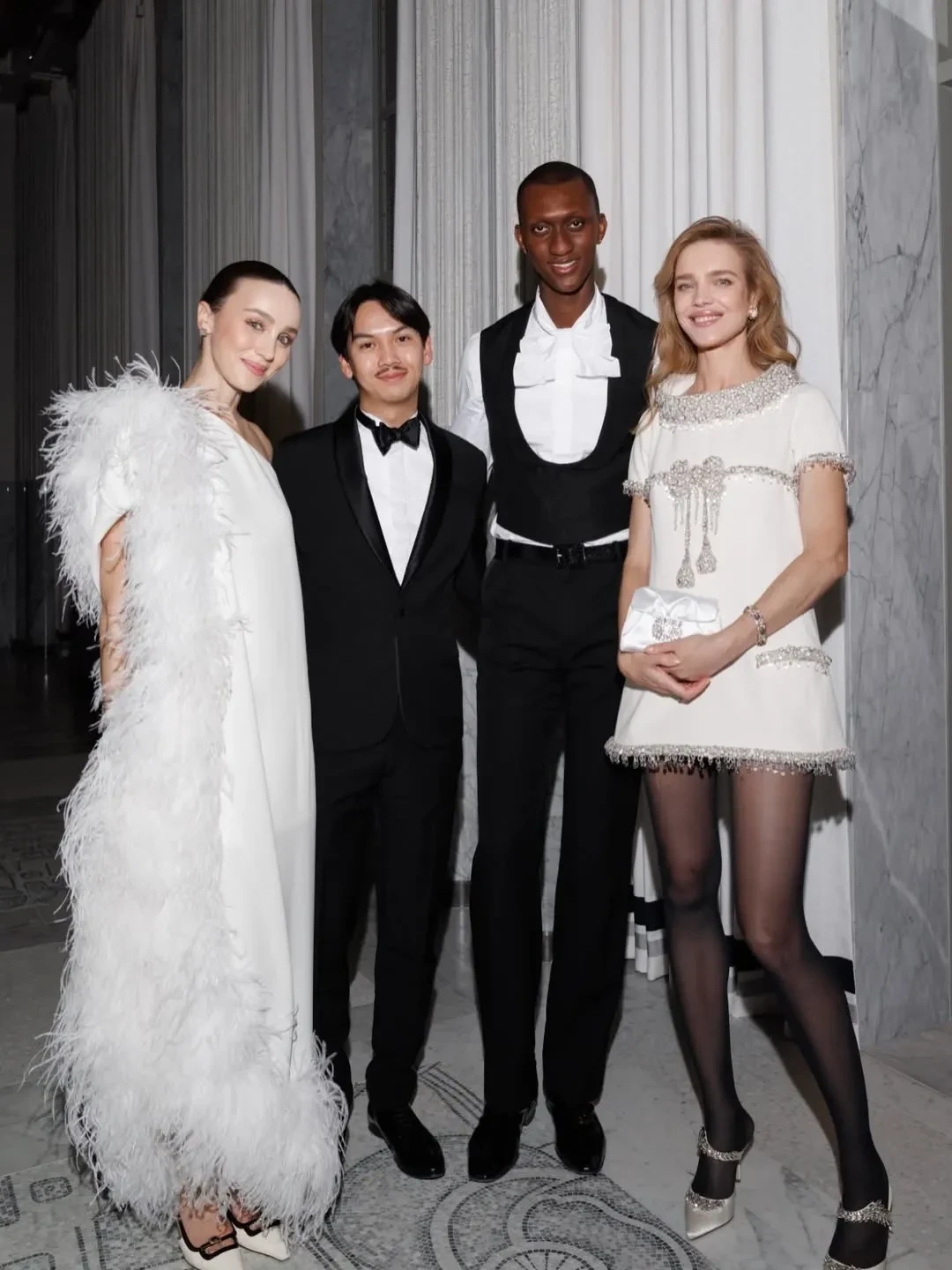 Наталья ВодяноваНаталья ВодяноваМэри Лист, Наталья ВодяноваМэри Лист, Наталья Водянова и гости вечераПри создании образа стилист супермодели Хьюго Тукас Терзиян вдохновлялся стилем Джеки Кеннеди, а также Одри Хепберн, завершив наряд "её любимыми" украшениями. "Платье придает этому образу атмосферу Джеки Кеннеди благодаря своей великолепной вышивке, вдохновлённой бантом на лифе императрицы Евгении 1855 года", — написал он в соцсетях.