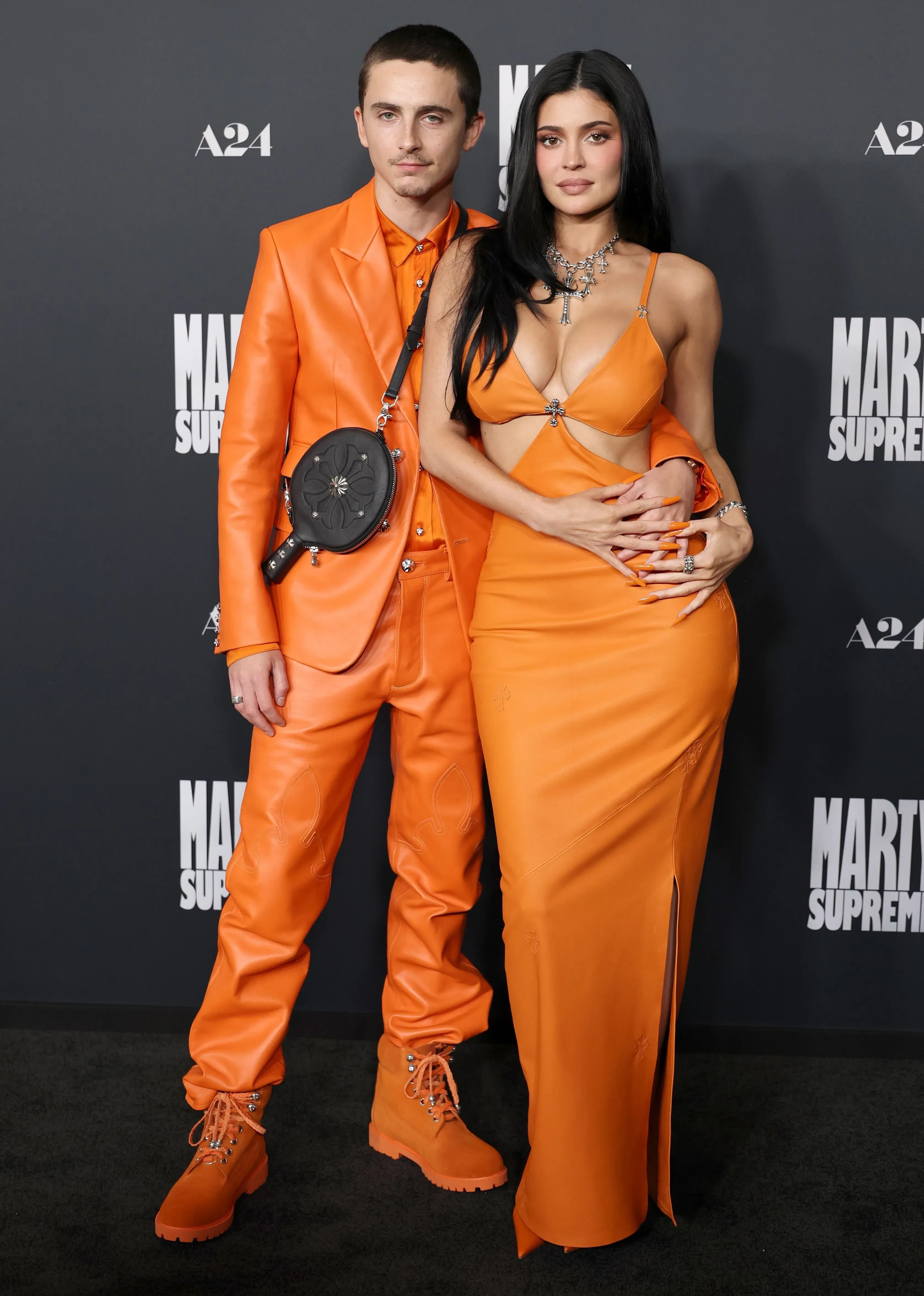 29-летний Шаламе и его возлюбленная позировали в оранжевых парных образах Chrome Hearts. Актёр надел кожаный костюм и сумку в форме ракетки для пинг-понга — это отсылка к роли, которую он играет в фильме. 28-летняя Кайли Дженнер позировала в платье с декольте и открытой спиной.
