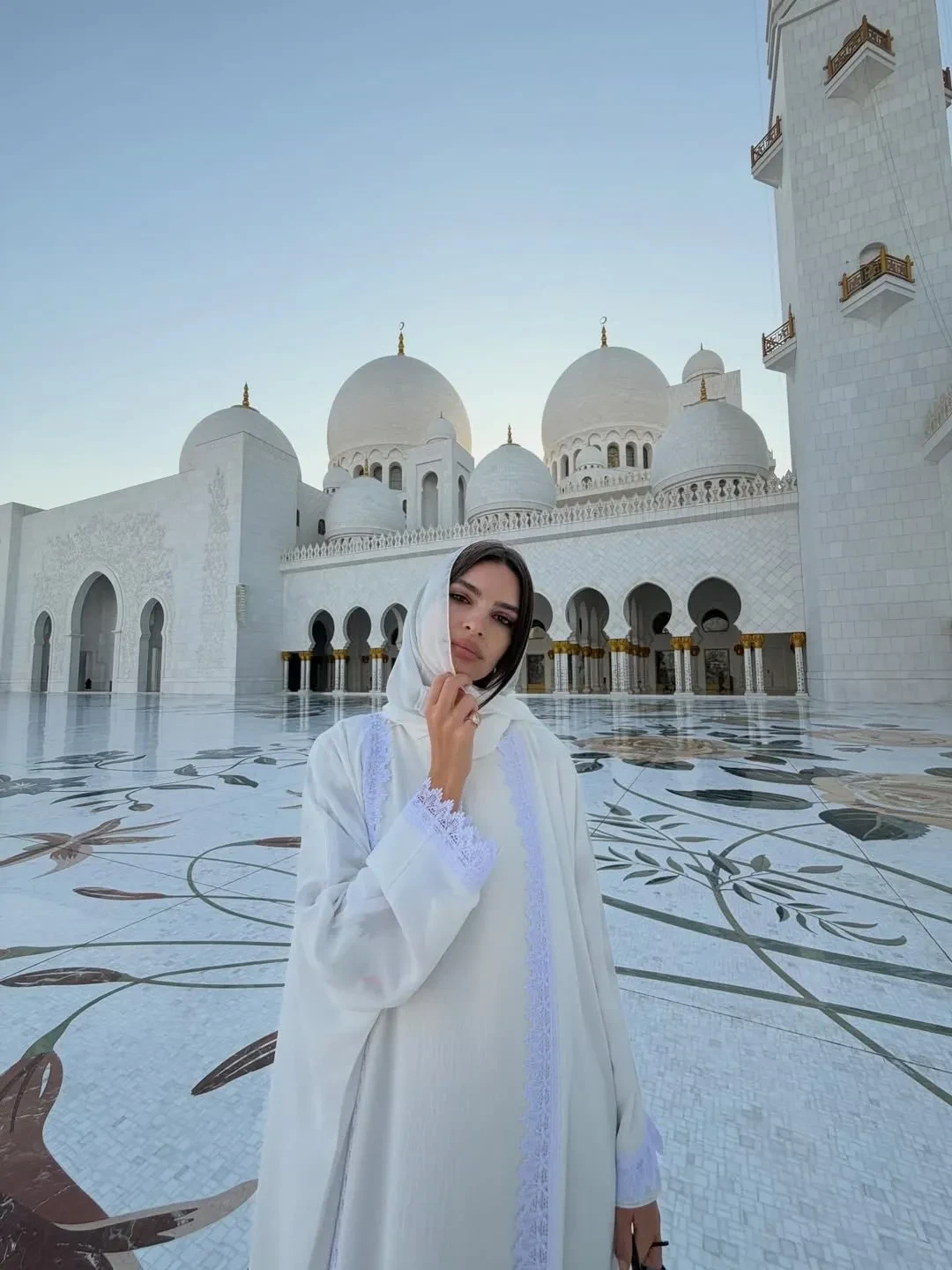 На новых снимках Ратаковски, которая часто публикует откровенные фото и выходит в свет в "голых" платьях, позирует около Большой мечети шейха Зайда в белой одежде и с покрытой головой.