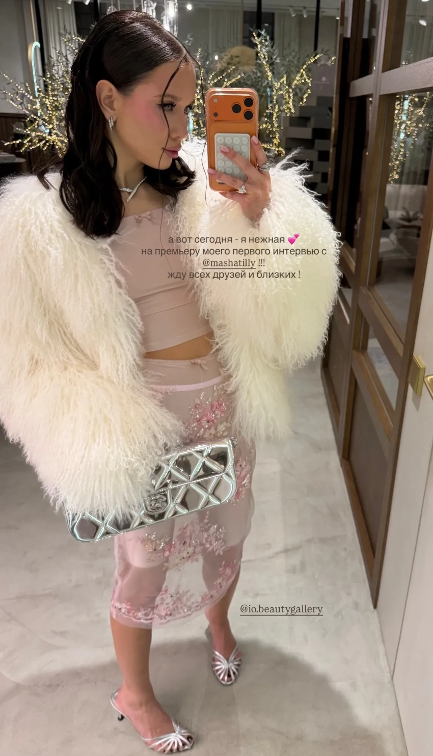 Аврора Киба пришла на мероприятие в розовом образе — в прозрачной юбке с цветочной вышивкой, которую она надела с шортами, и топе с открытыми плечами. Свой наряд она дополнила короткой белой шубой и серебристым клатчем Chanel. Лепс тоже выбрал наряд в розово-лиловых оттенках. Пара вместе позировала фотографам, держась за руки.