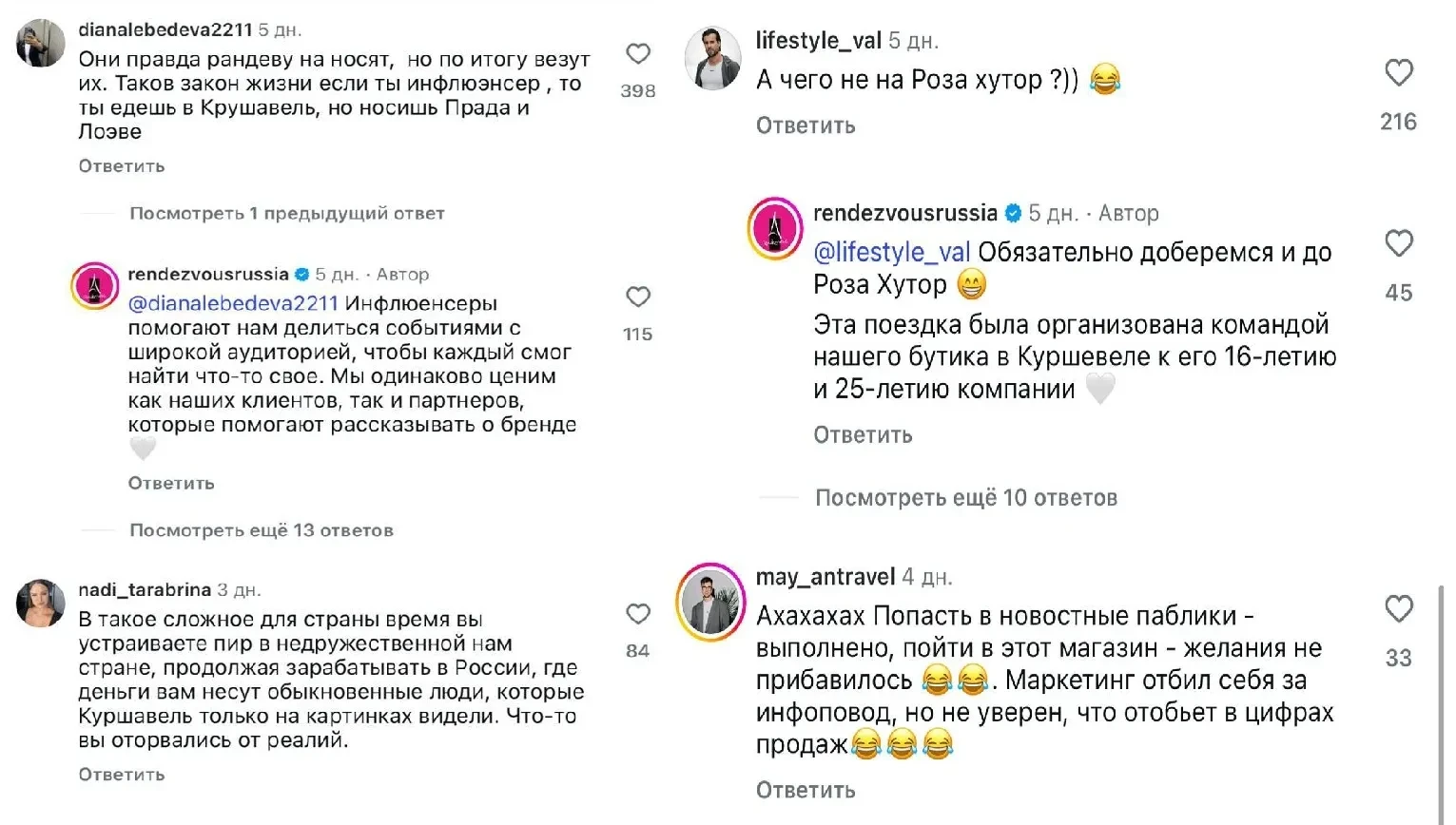 В компании попытались объяснить мероприятие тем, что его организацией занимался их бутик в Куршевеле и что для клиентов будут другие "интересные" выезды. При этом неудобные вопросы, как, например, о том, почему деньги, которые потратили на мероприятие, не направили на гуманитарную помощь, администрация якобы удаляет. И критики меньше не стало.