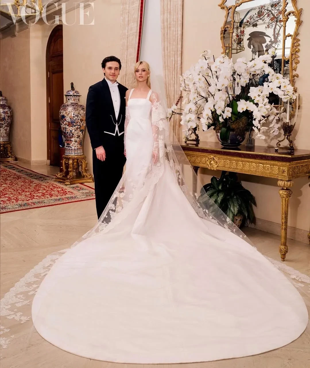 Никола Пельтц и Бруклин БекхэмВ интервью Фремер рассказывала, что кутюрное свадебное платье Valentino для Пельтц разрабатывали на протяжении целого года. Над платьем работала команда на тот момент креативного директора Пьерпаоло Пиччоли и сам дизайнер, а жена Бруклина дважды приезжала на примерки в основной офис бренда в Риме. Главные швеи марки также специально прилетали в США перед церемонией на генеральную примерку.
