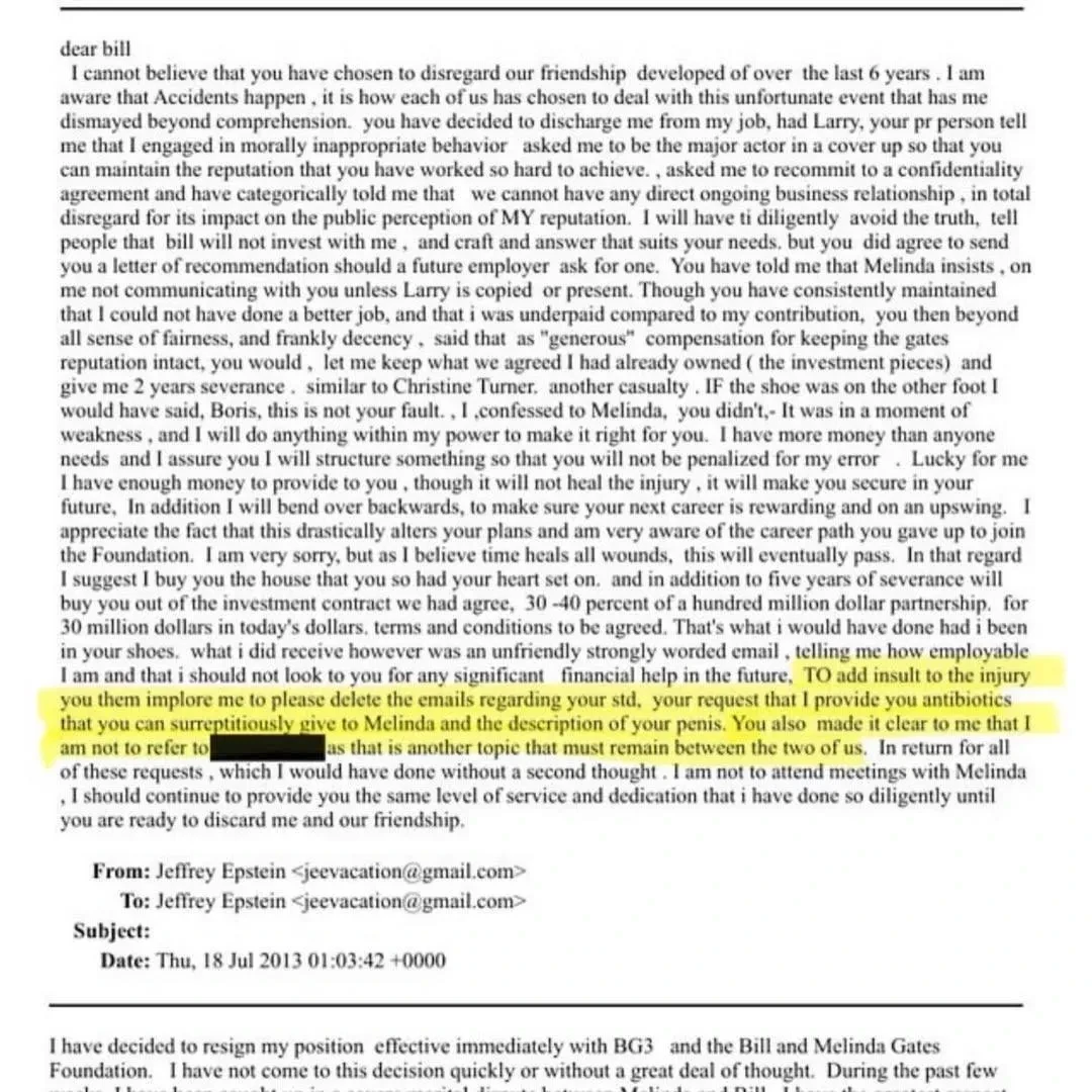 Кроме того, в материалах Эпштейна обнаружены частные письма, в которых финансист утверждает, что основатель Microsoft Билл Гейтс подхватил венерическое заболевание после сексуальных контактов с "русскими девушками". В одном из писем говорится, что Гейтс якобы требовал у Эпштейна антибиотики, а позже тайно подсыпал их своей бывшей супруге Мелинде, которую успел заразить. В другом письме, начинающемся со слов "Дорогой Билл", Эпштейн жалуется на разрыв дружбы с Гейтсом. Представитель предпринимателя уже опроверг эту информацию, назвав её в беседе с Daily Mail "абсолютно абсурдной и ложной". "Единственное, что демонстрируют эти документы, — это разочарование Эпштейна из-за того, что у него не сложились постоянные отношения с Гейтсом, а также то, на что он был готов пойти, чтобы заманить его в ловушку и оклеветать", — приводит издание слова адвоката.