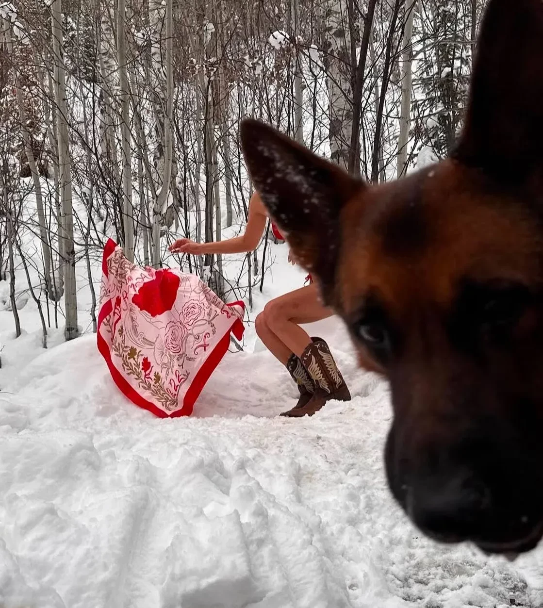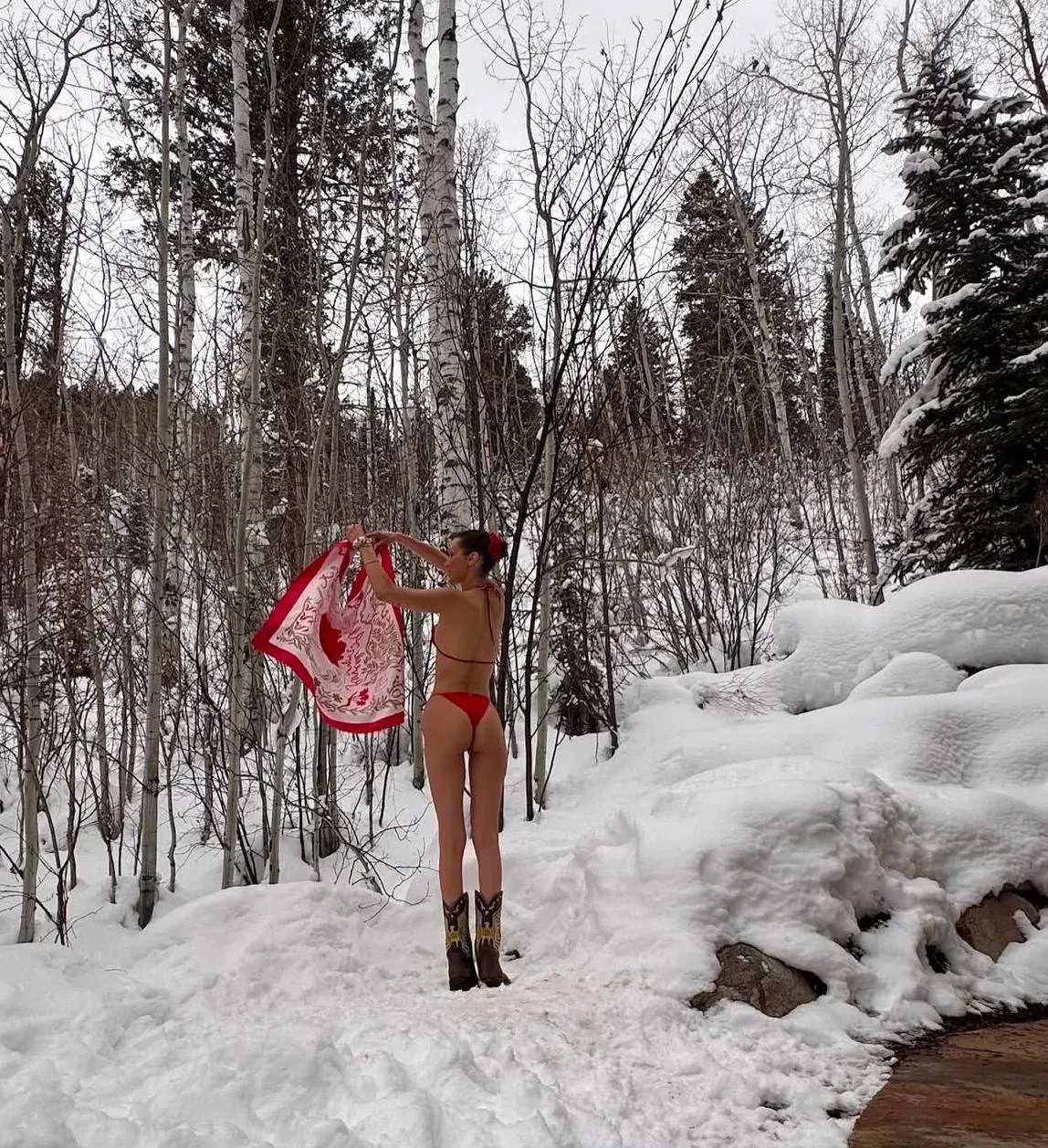 Белла Хадид опубликовала в инстаграме* новую фотосессию: на кадрах 28-летняя модель позирует в купальнике и ковбойских сапогах в снегу в окружении берёз.