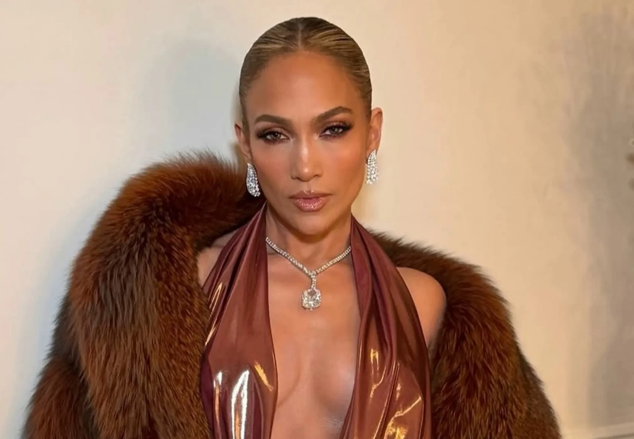 На мероприятие актриса и певица пришла в платье в пол шоколадного цвета с открытой спиной и глубоким декольте. Также образ звезды добавляли шубка в тон, которую Лопес периодически снимала, структурный клатч и бриллиантовые украшения.