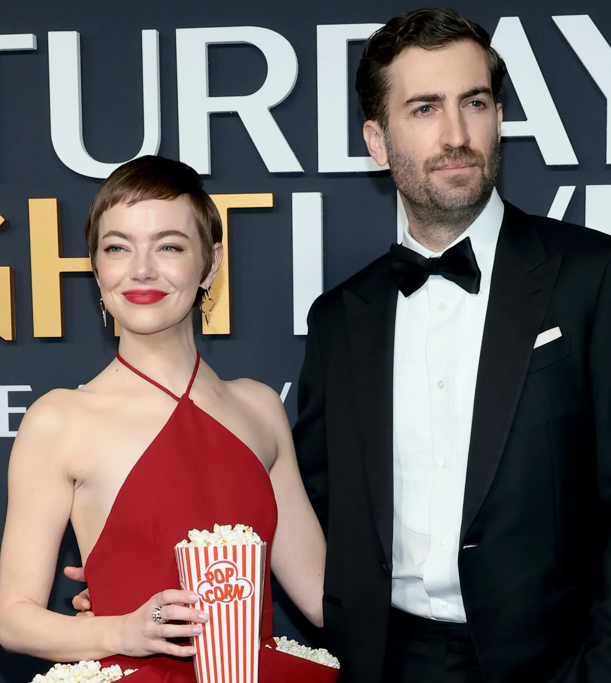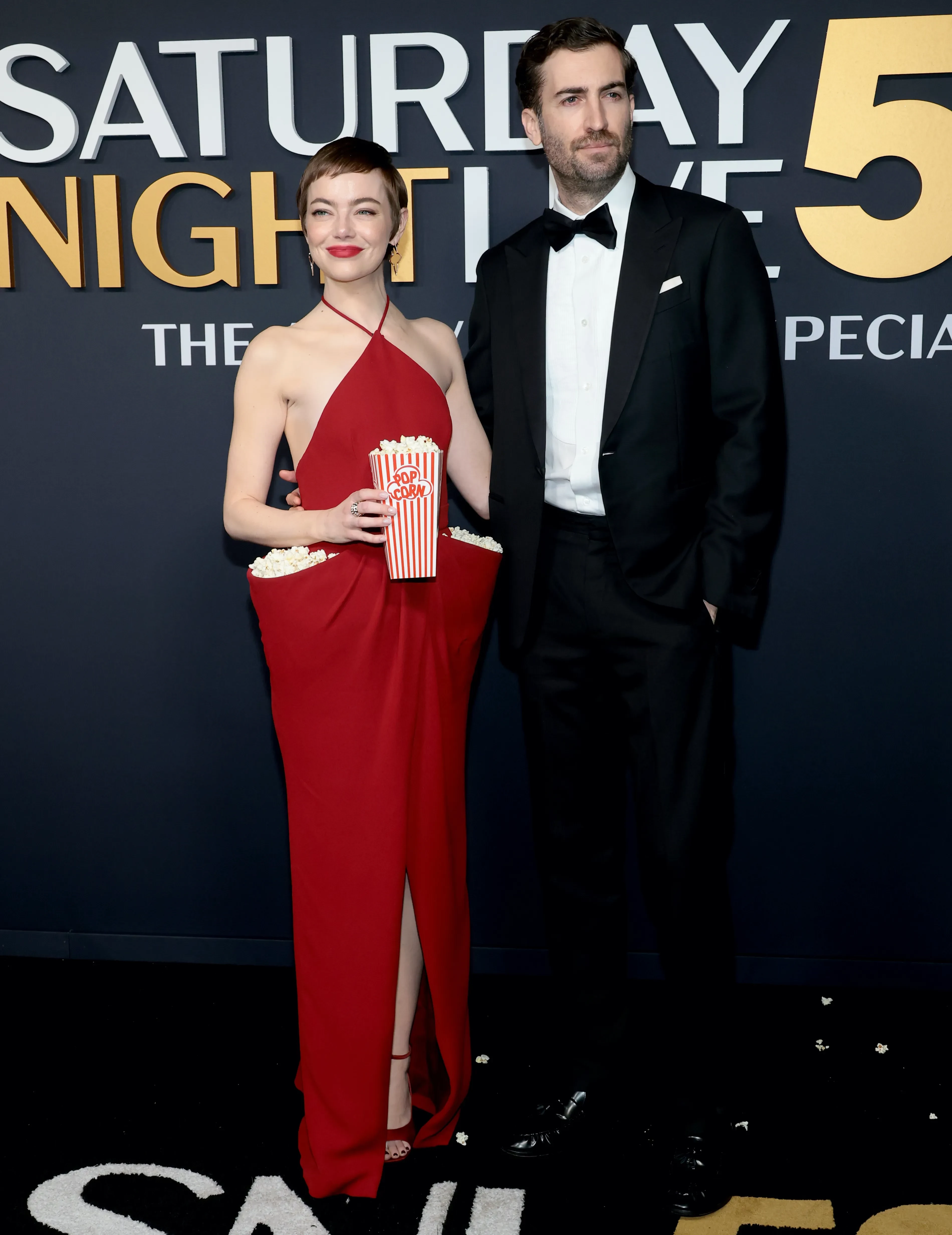 Эмма Стоун и Дейв Маккери/Фото: Dimitrios Kambouris/Getty ImagesЭмма Стоун позировала в красном платье Louis Vuitton с набитыми попкорном карманами. Супруг звезды Дейв Маккери до 2018 года был сценаристом на Saturday Night Live (на съёмках шоу они и познакомились), сейчас такую же должность занимает муж Скарлетт Йоханссон Колин Жост. Ким Кардашьян пришла на мероприятие в серебристом платье Balenciaga, а Дакота Джонсон выбрала чёрное платье с разрезами по бокам.