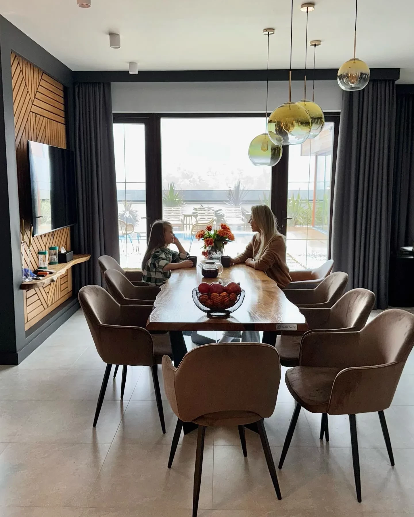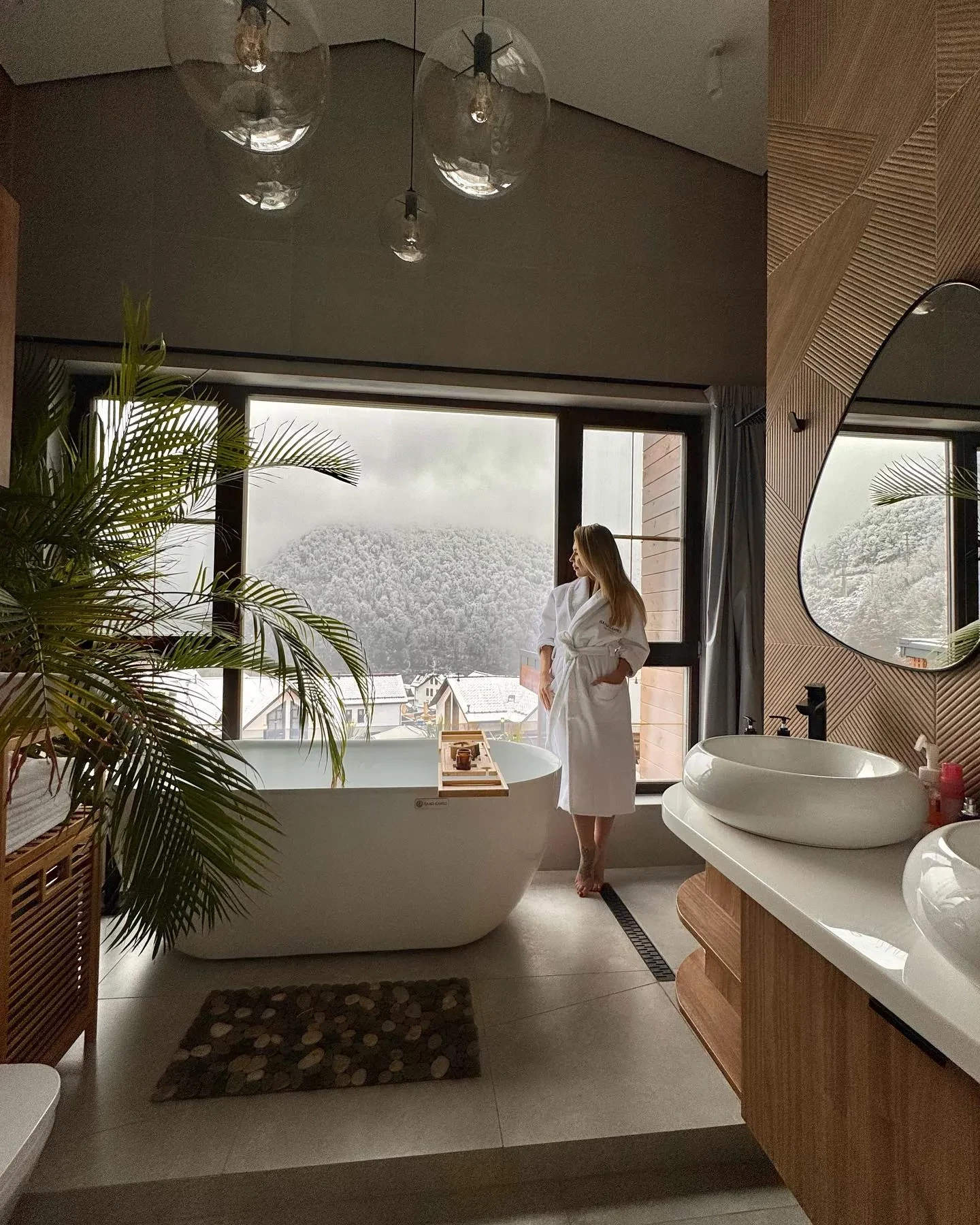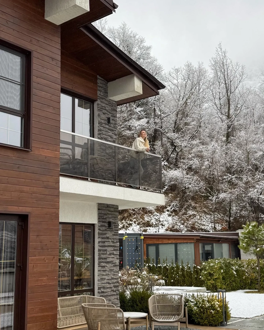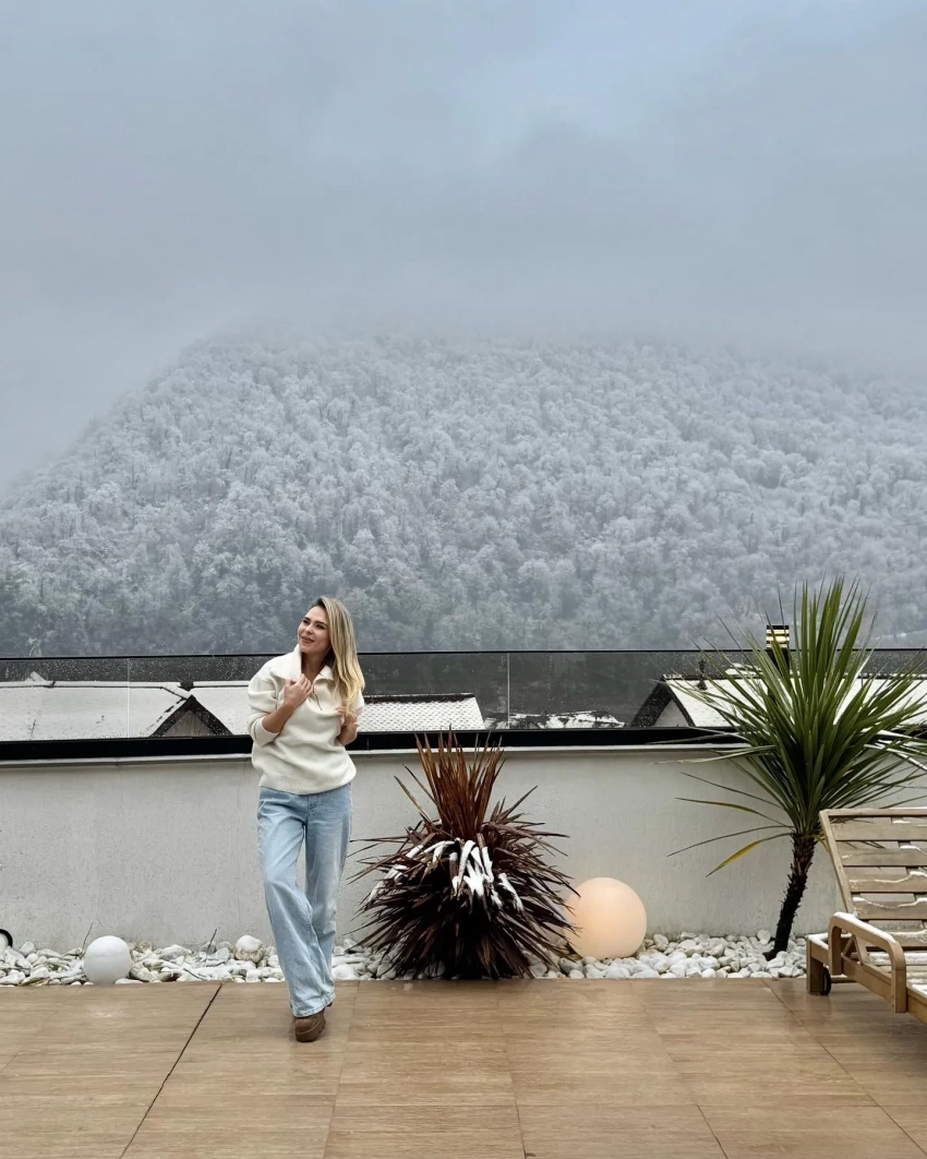 На снимках Пелагея позирует на фоне заснеженных деревьев, а также на балконе снятого в Красной Поляне дома. Также она добавила несколько совместных снимков со своей дочерью Таисией.