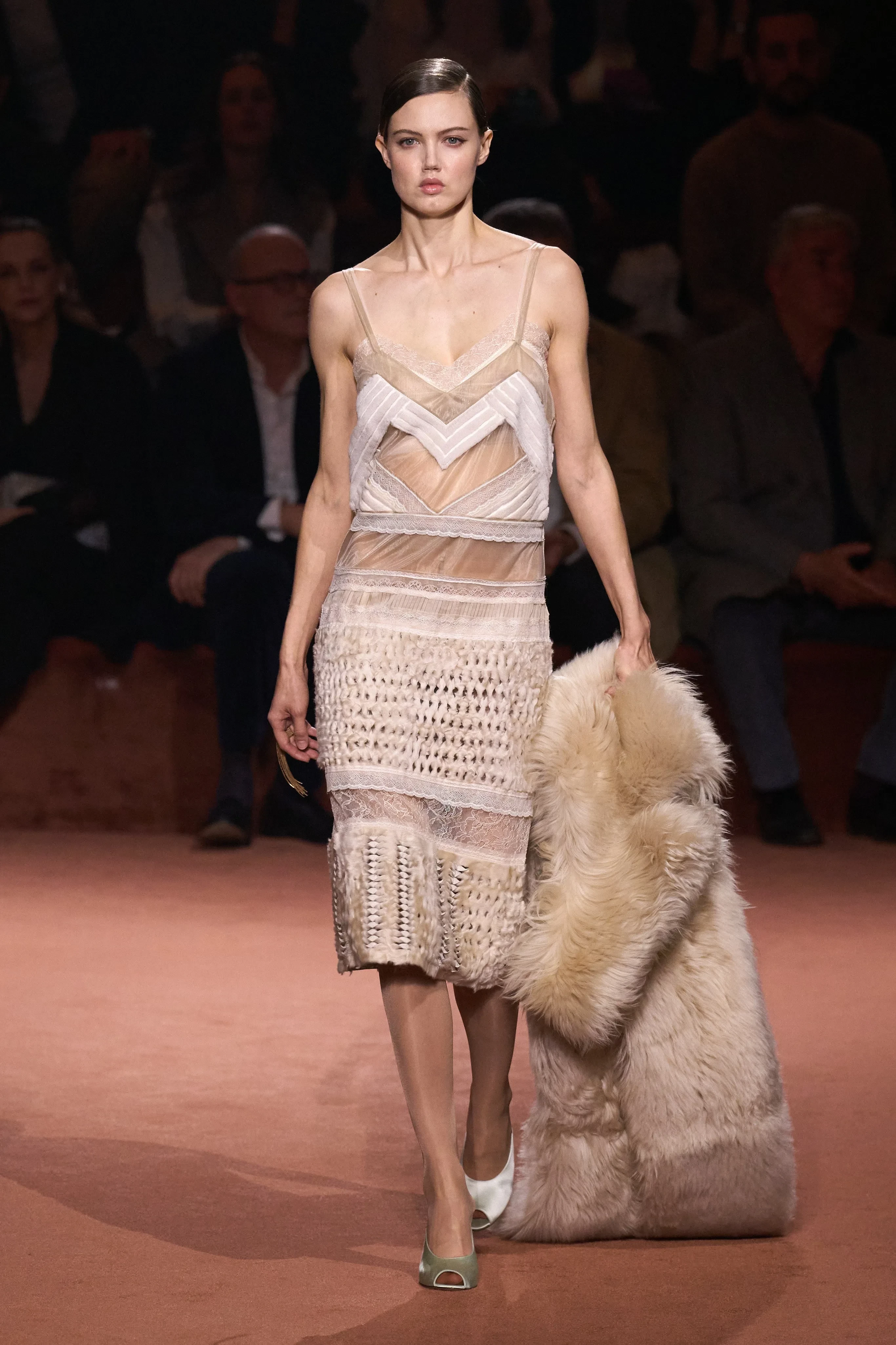 Креативный директор модного дома Сильвия Вентурини-Фенди представила коллекцию из 85 луков. Главный акцент она сделала на меховых изделиях и вышивке из драгоценных камней, которыми были расшиты юбки, платья, пальто и обувь. В коллекции также много вещей из кожи, полупрозрачных тканей и "возрастных" силуэтов. Яркой деталью образов стали телесные капроновые колготки с мысами разных оттенков, которые "выглядывали" из туфель.