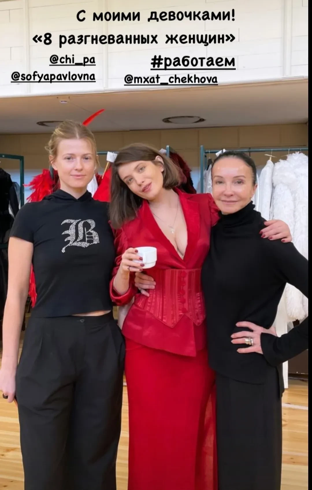 В постановке задействованы, среди прочих, Дарья Мороз, Софья Эрнст и Анна Чиповская. В своих соцсетях Алла опубликовала совместное фото с Софьей и Анной, подписав снимок так: “С моими девочками”. Она уточнила, что “встретила свой новый год в репетициях и предпремьерных хлопотах”, а также поблагодарила коллег и друзей за поздравления: “Спасибо всем за море цветов, подарков, нежных слов, вкусностей, которыми меня осыпали сегодня”.
