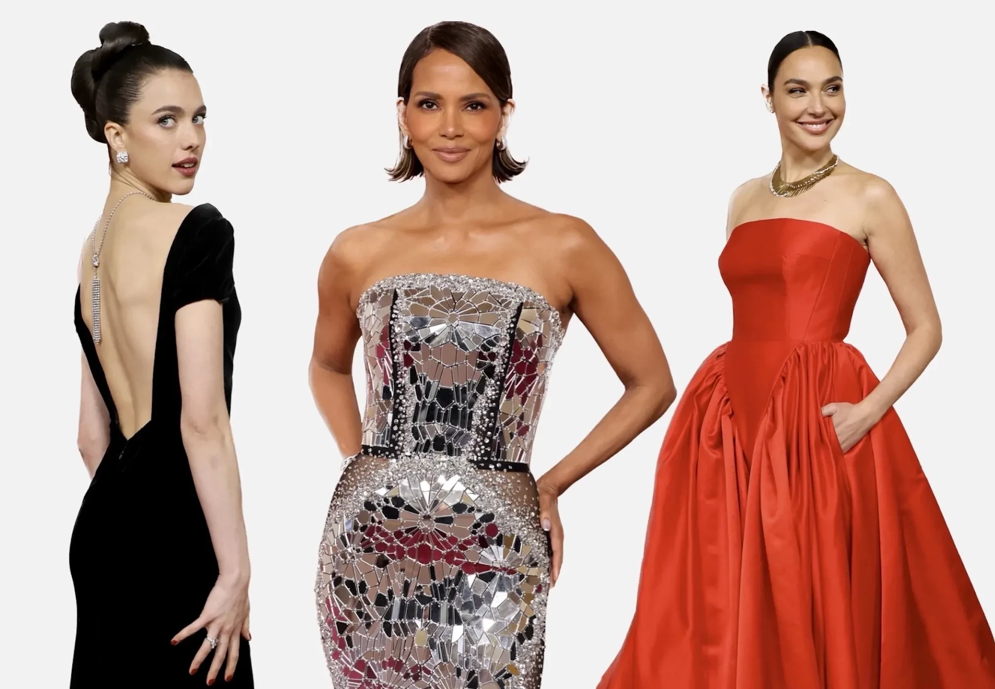 62-летняя Деми Мур позировала в облегающем кутюрном платье Armani Privé и бриллиантовых серьгах Chopard в 17 карат, а её коллега по "Субстанции" Маргарет Куэлли надела платье Chanel с открытой спиной. Селена Гомес, которую подозревают в похудении с помощью "Оземпика", пришла в блестящей "чешуе" Ralph Lauren. Кутюрное платье украшено кристаллами ручной работы и более чем 16 тысячами стеклянных капель. Эль Фаннинг примерила трендовый babydoll-образ Givenchy в стиле Одри Хепберн с бантом (они были популярны на дорожке в этом году), а Лили Роуз Депп — нуарный образ Chanel. Галь Гадот — одна из немногих селебрити, кто выбрал яркий наряд и пришёл на церемонию в пышном алом платье Prada и колье Tiffany & Co.