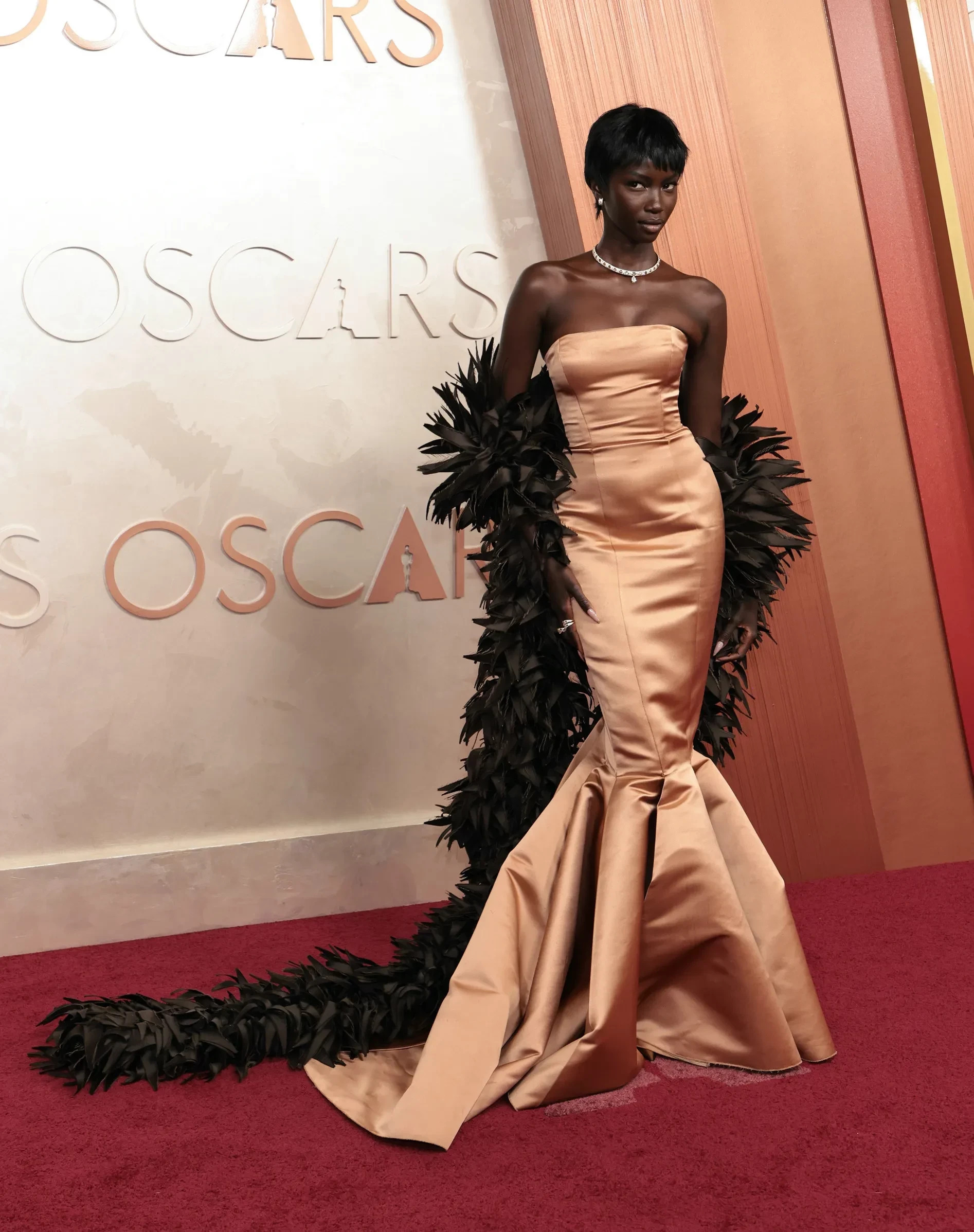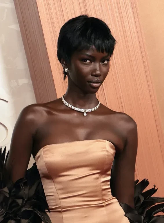 Эмма Стоун примерила лаконичный образ в стиле 1920-х: блестящее платье-майку Louis Vuitton и укладку в духе "старого Голливуда". Обладательница звания "Модель года — 2024" Анок Яй выбрала трендовое сочетание оттенков и позировала на дорожке в кастомном платье Marni бронзового оттенка с тёмно-коричневой накидкой из перьев. Ещё один модный образ выгуляла звезда "Бруталиста" Фелисити Джонс в серебристом платье Armani с бантом. Лупита Нионго тоже надела наряд Chanel с бантом.