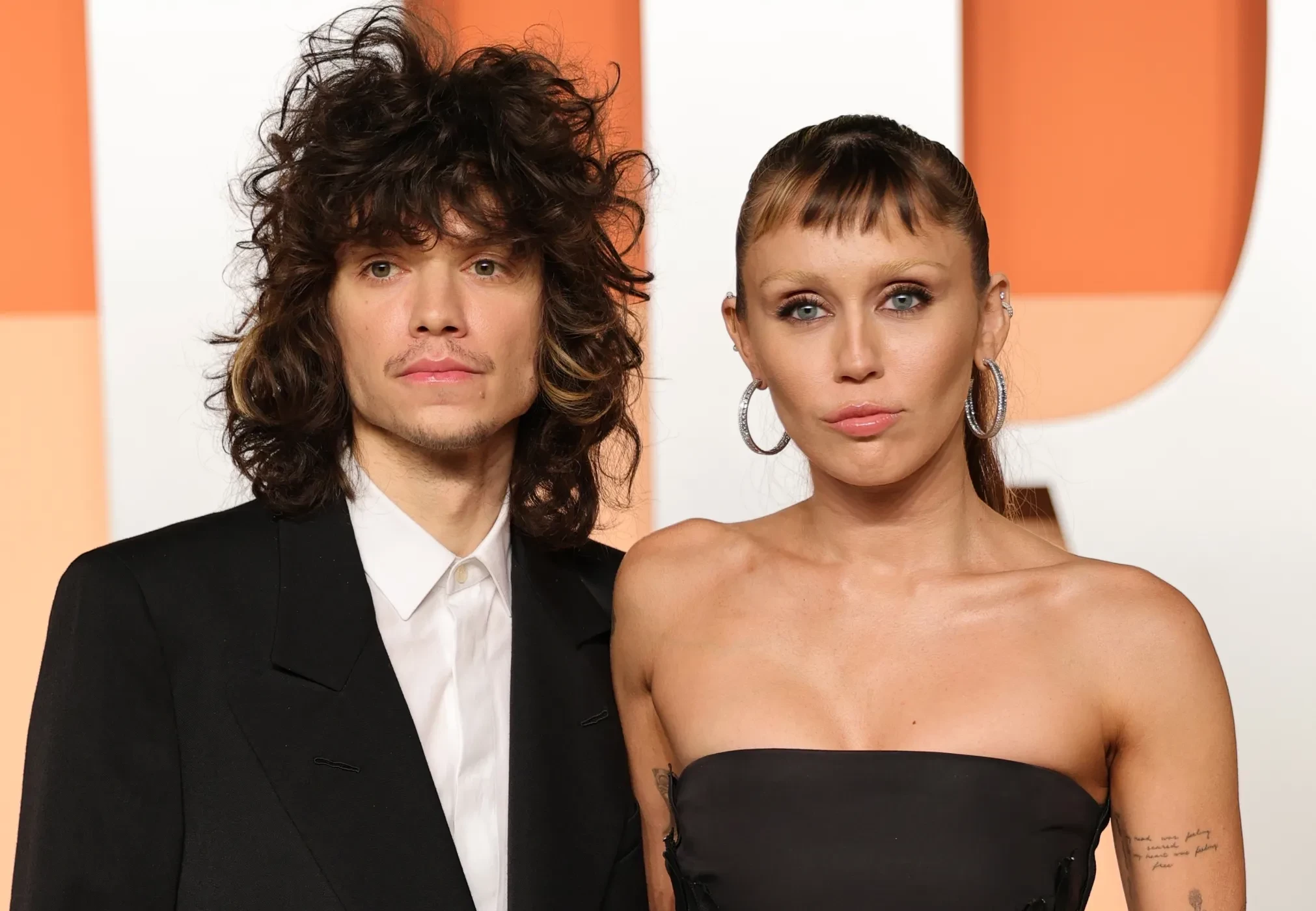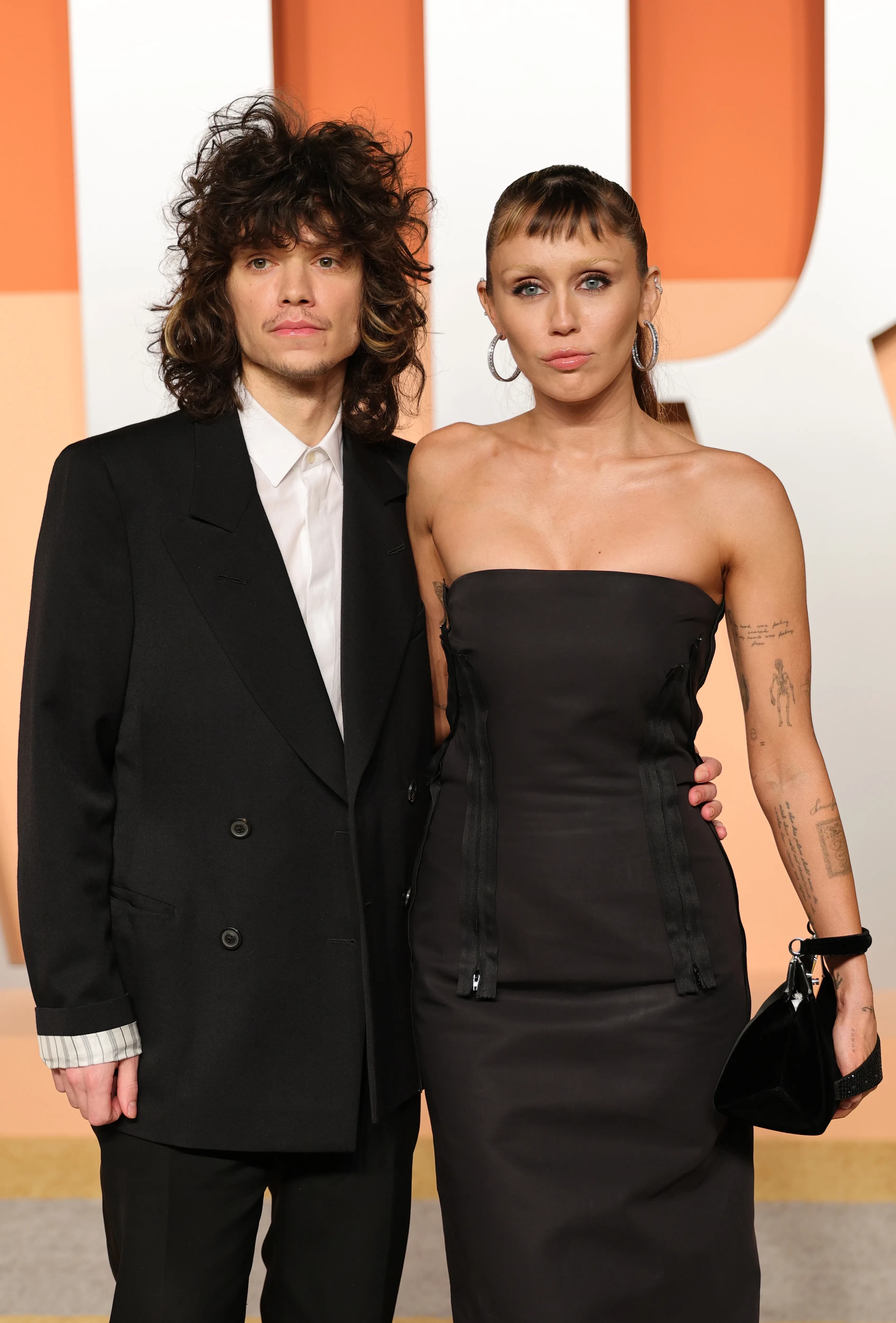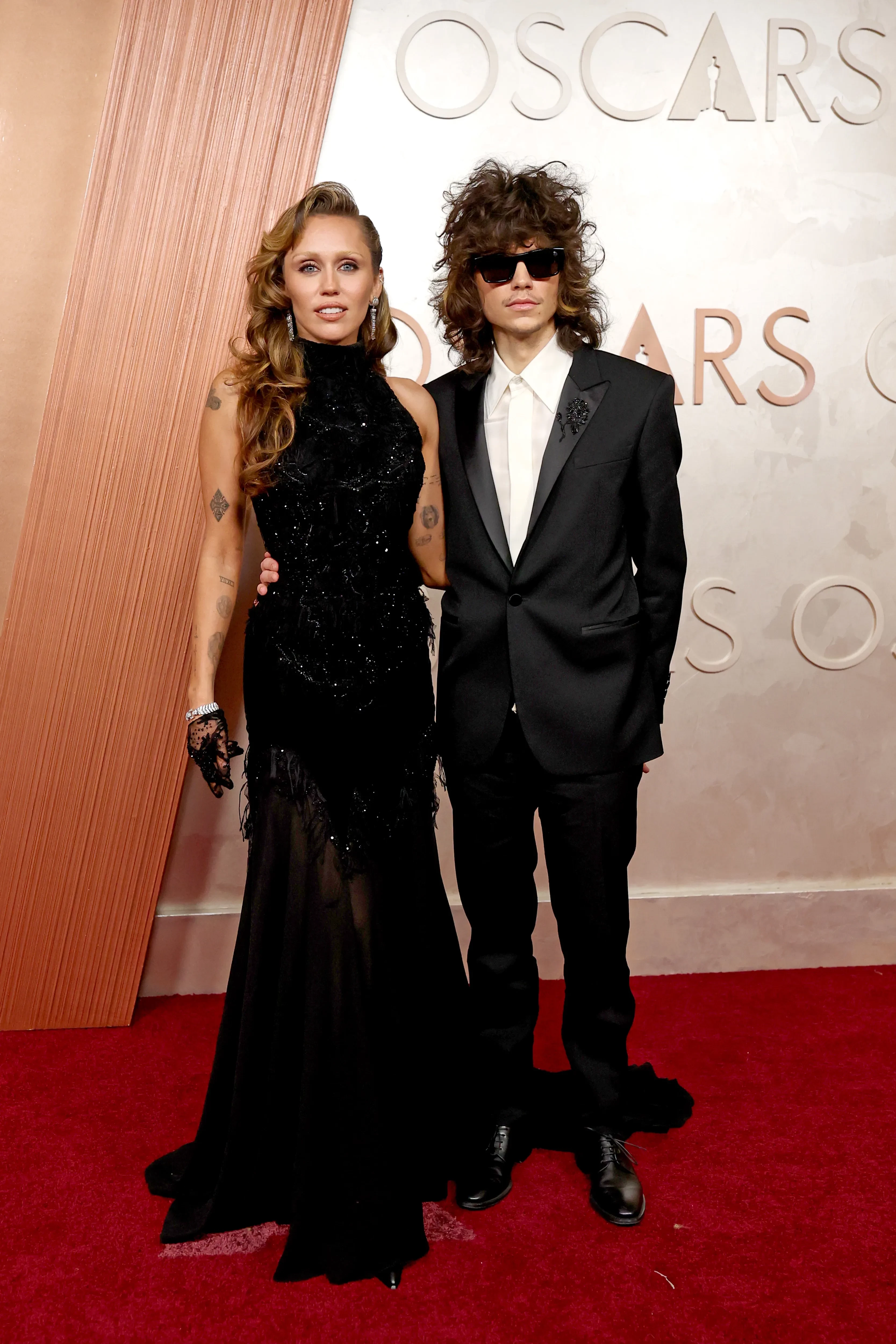 Для главного события в мире кино 32-летняя певица выбрала чёрное платье в пол с открытыми плечами от Alexander McQueen. Образ был дополнен кружевными перчатками и объёмными голливудскими локонами. В макияже Майли сделала ставку на естественность, выбрав нейтральные оттенки, однако удивила публику обесцвеченными бровями. Макс Морандо, в свою очередь, предпочёл классический чёрный смокинг с белой рубашкой, разбавив образ солнцезащитными очками.
