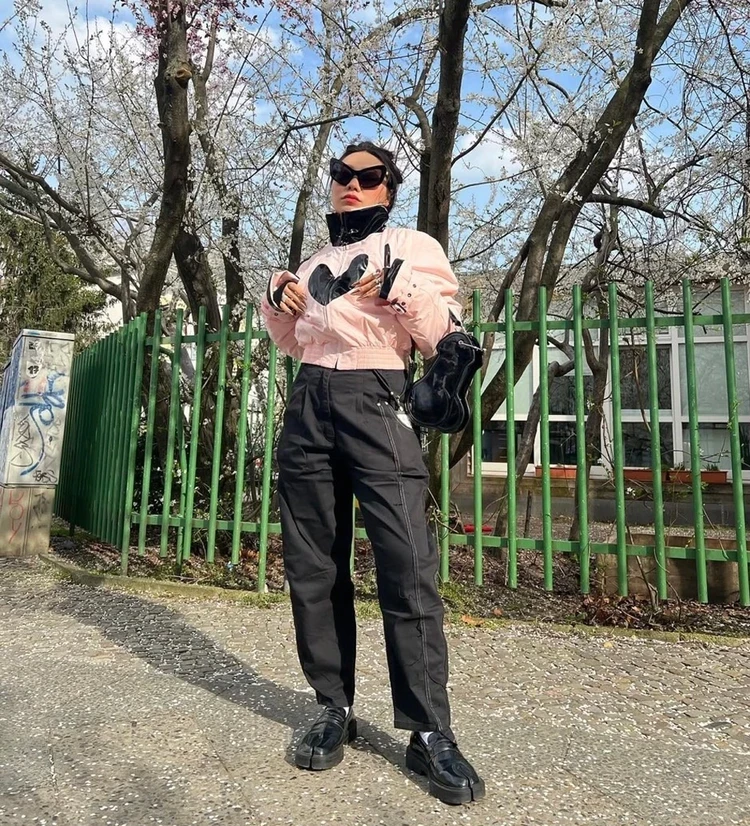 Ян Гэ составила образ в беспроигрышной черно-розовой цветовой гамме. Главный акцент лука — это, конечно же, оригинальная розовая куртка с черным лаковым сердцем. Ее певица и актриса дополнила широкими брюками, лоферами и лаковой сумкой. Плюс очки в оправе «кошачий глаз». Игриво и в стиле Ян Гэ.