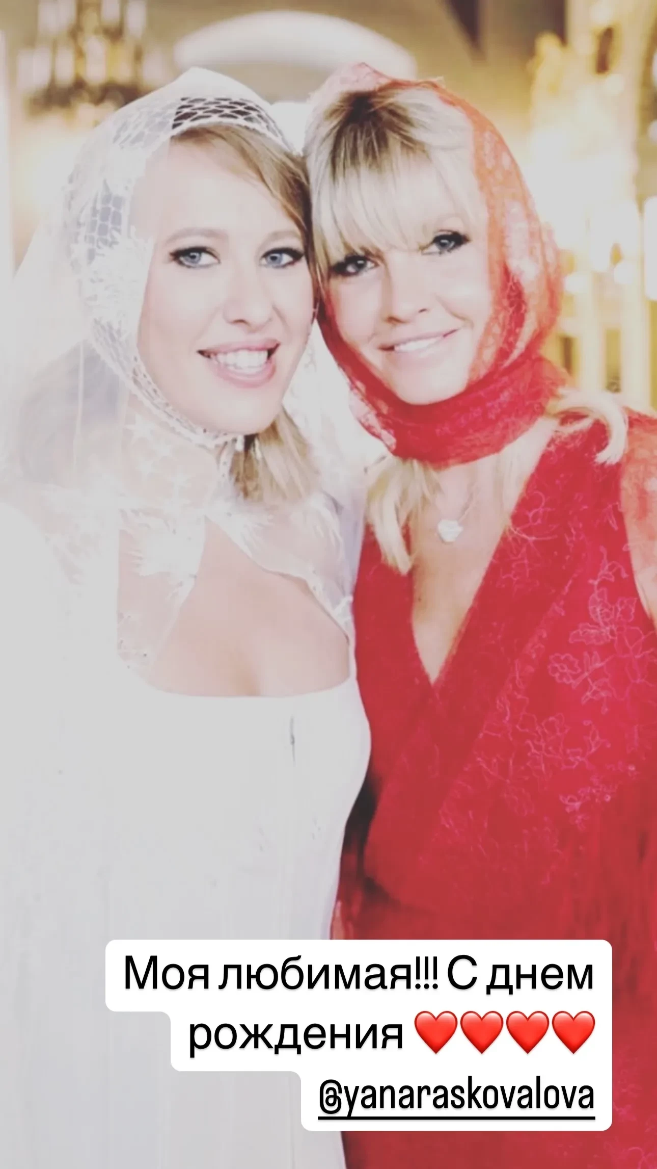 Ксения Собчак показала архивное фото с венчания с Константином Богомоловым в своем инстаграме*, на котором запечатлена с Яной Расковаловой. Таким образом она решила поздравить дизайнера с её 49-м днём рождения.